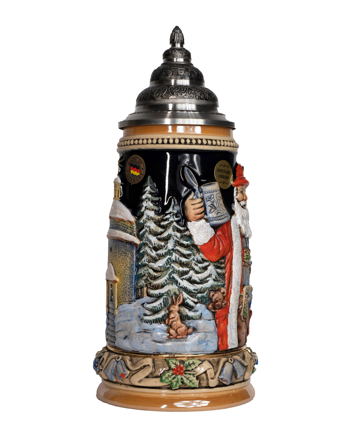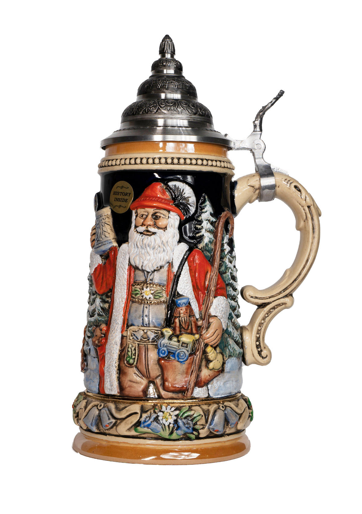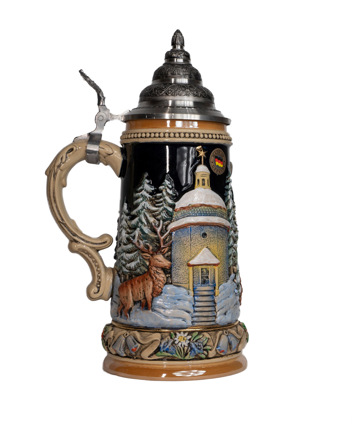 Traditional German Beer Stein Alpine Santa with silent night chapel. This product is handmade in Germany and can be used for a variety of decoration and as a real stein. This beer stein is a limited edition and is individually numbered by the painter (5,000 of them worldwide). Certificate of authenticity included.