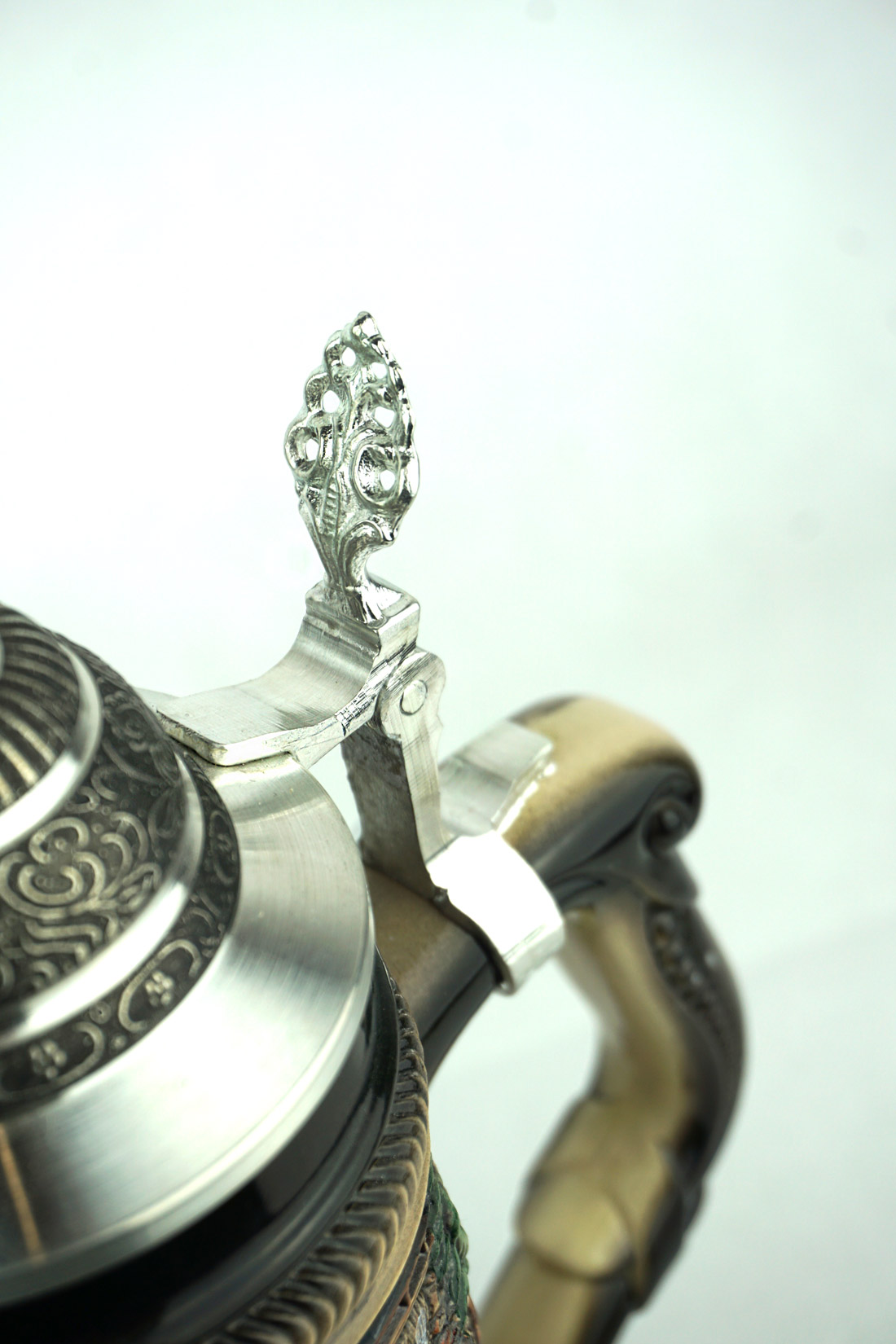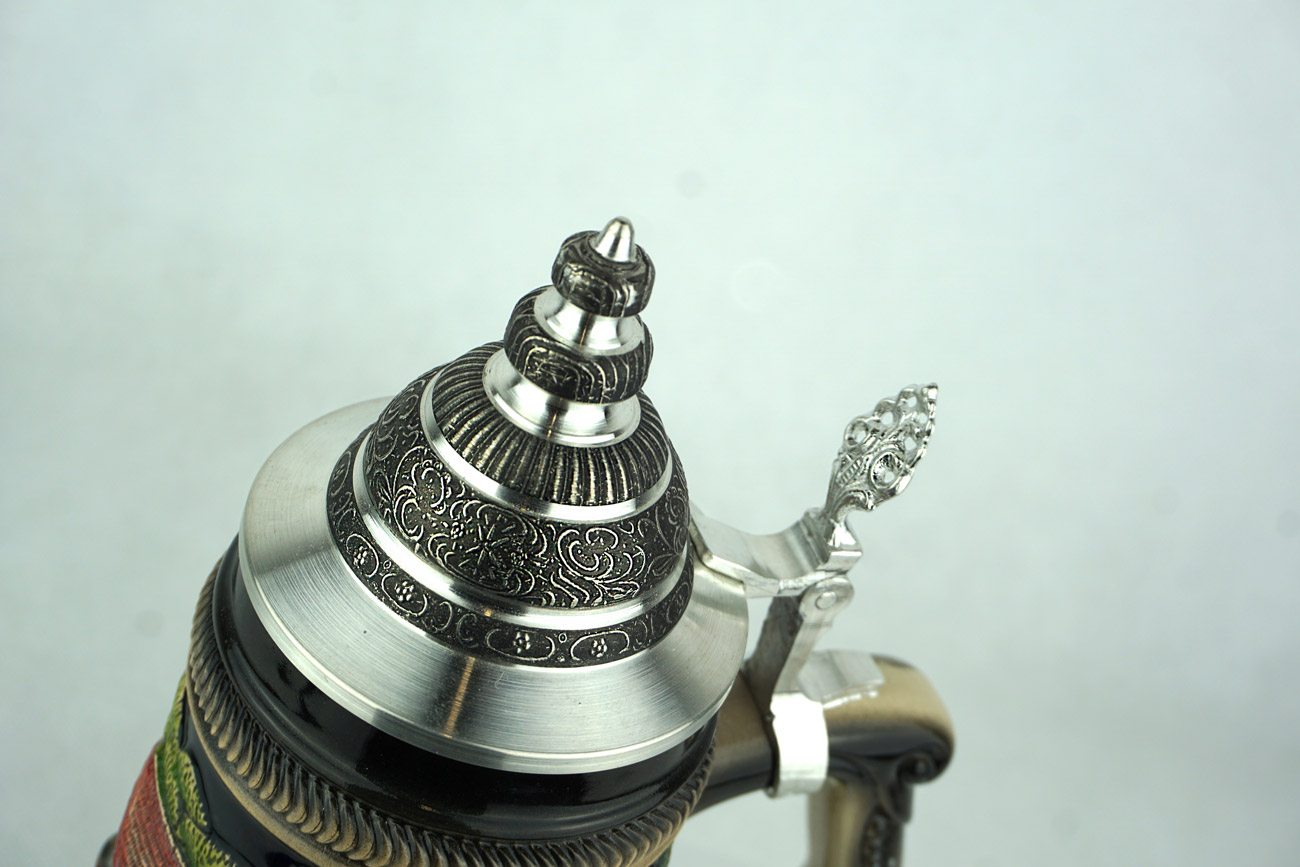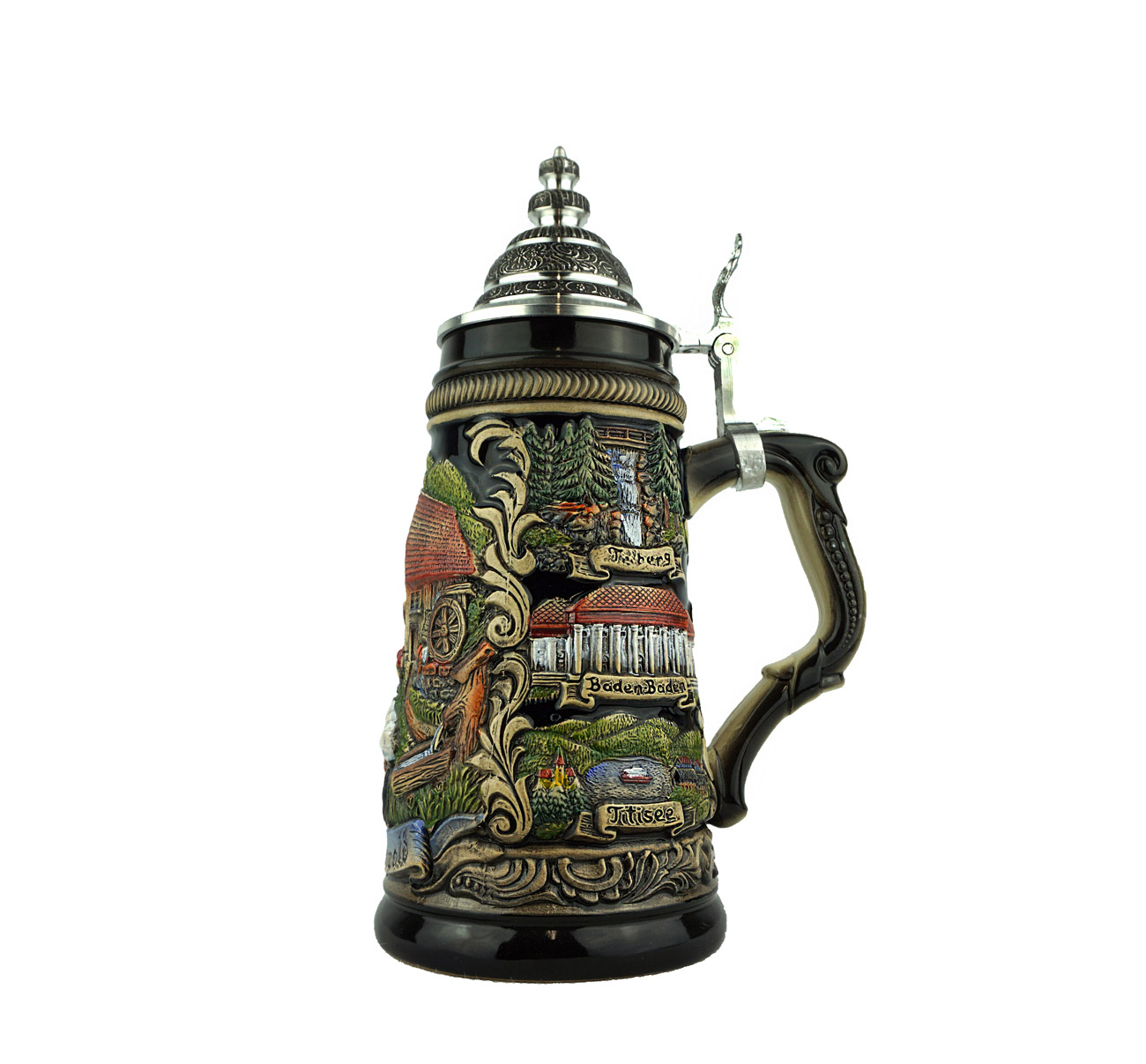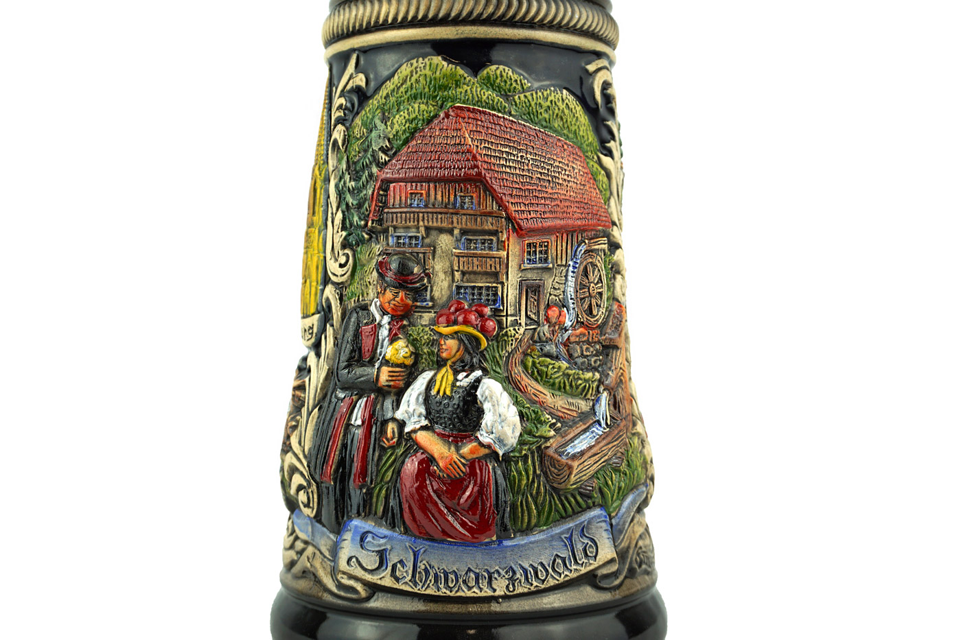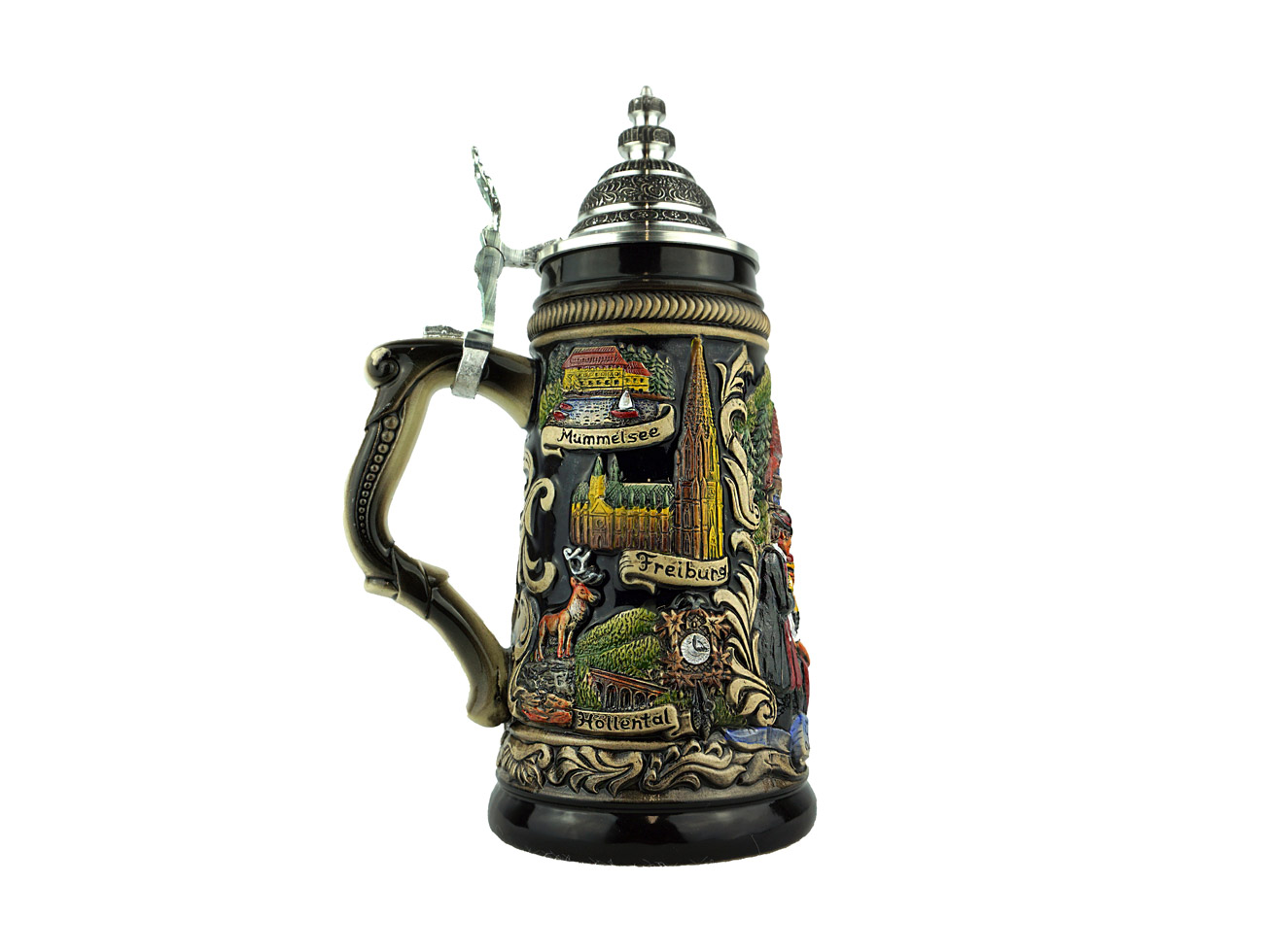 This is one of the most popular beer mugs which represents the Black Forest and its traditions. Everything seen on this stein, traditional costumes worn by the couple painted at the front, the forest landscape in the back, together with all traditional motifs create an idyllic picture of the Black Forest. On each side of this stein you can find the most popular places of the area such as; Lake Titisee, the Triberg waterfalls, the old 1800's bridge, and the Freiburg Cathedral. This beer stein is a limited edition and is individually numbered by the painter (5,000 of them worldwide). Certificate of authenticity included.