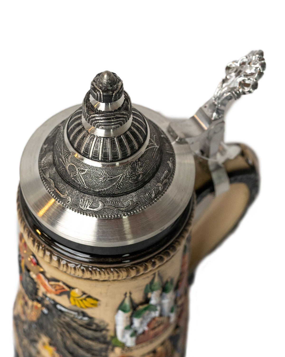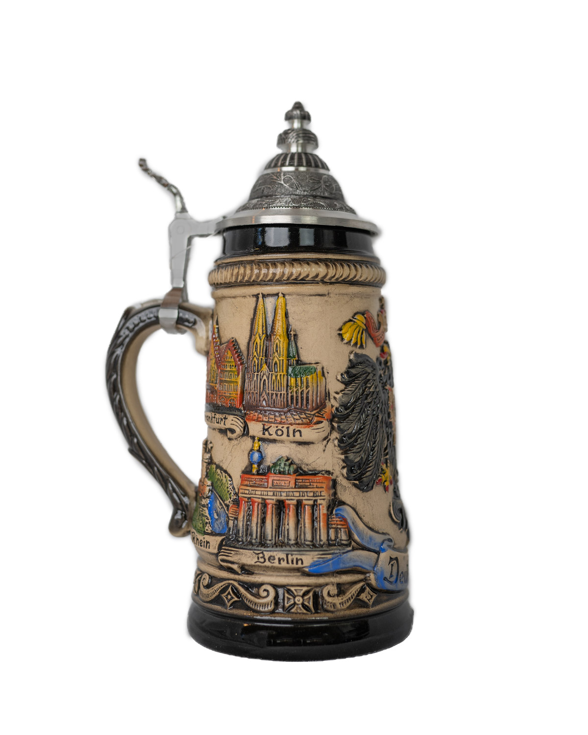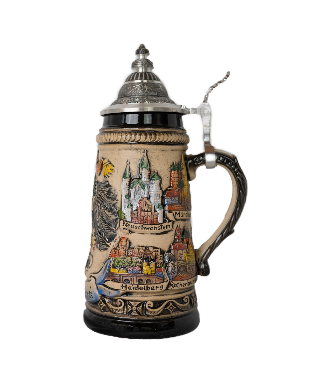 This beer stein has a beige glaze and is decorated with the symbolic German eagle. Its sides are decorated with famous German cities which you may have seen during your trip here!