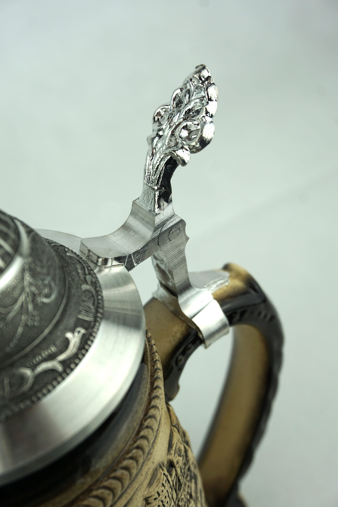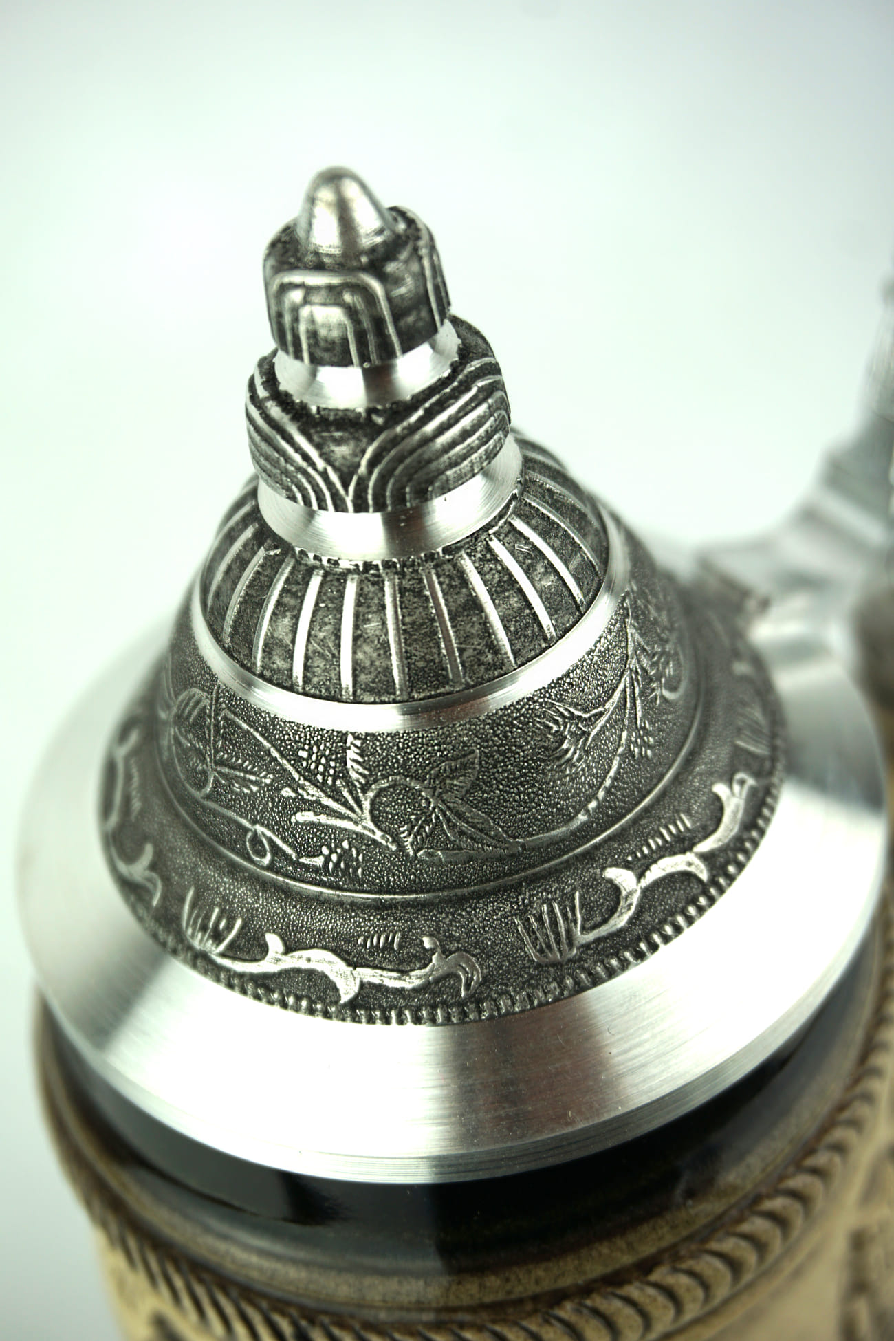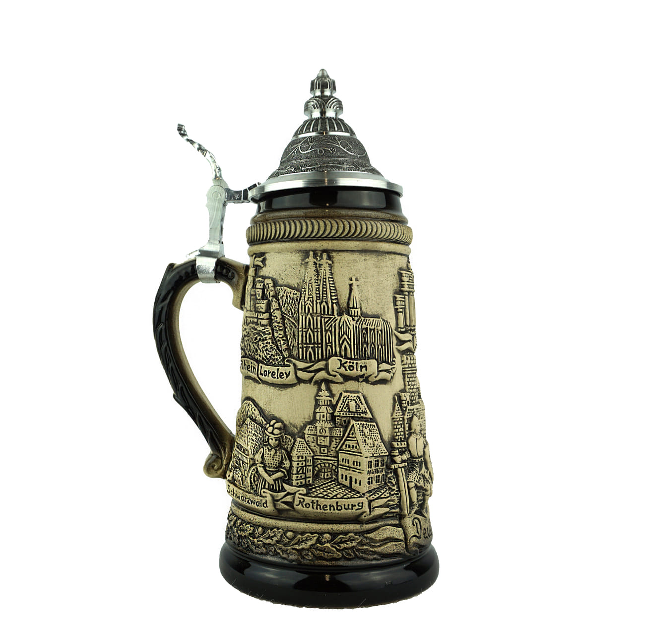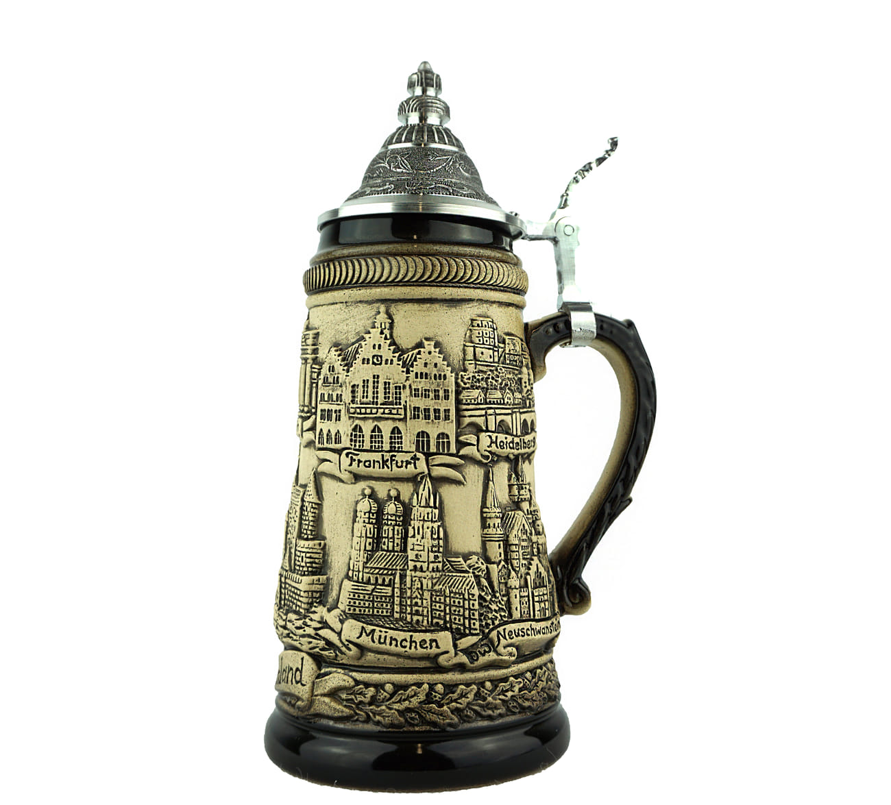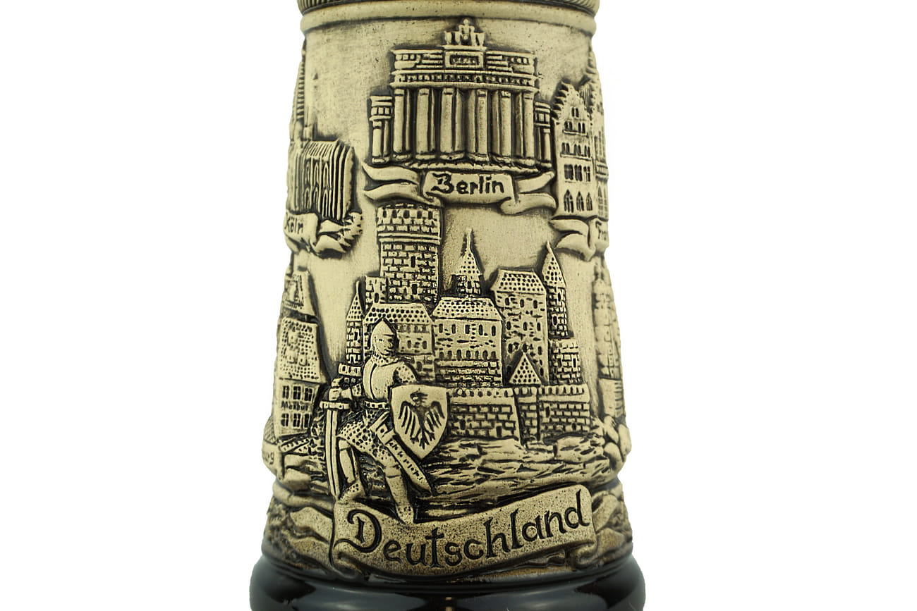 This beer stein with a beige glaze is decorated with the largest German cities and some of the historical monuments they are known for. The front shows a castle with a knight and the sign "Deutschland" ("Germany" in German). This beer stein is a limited edition and is individually numbered by the painter (10 000 of them worldwide). Certificate of authenticity included.