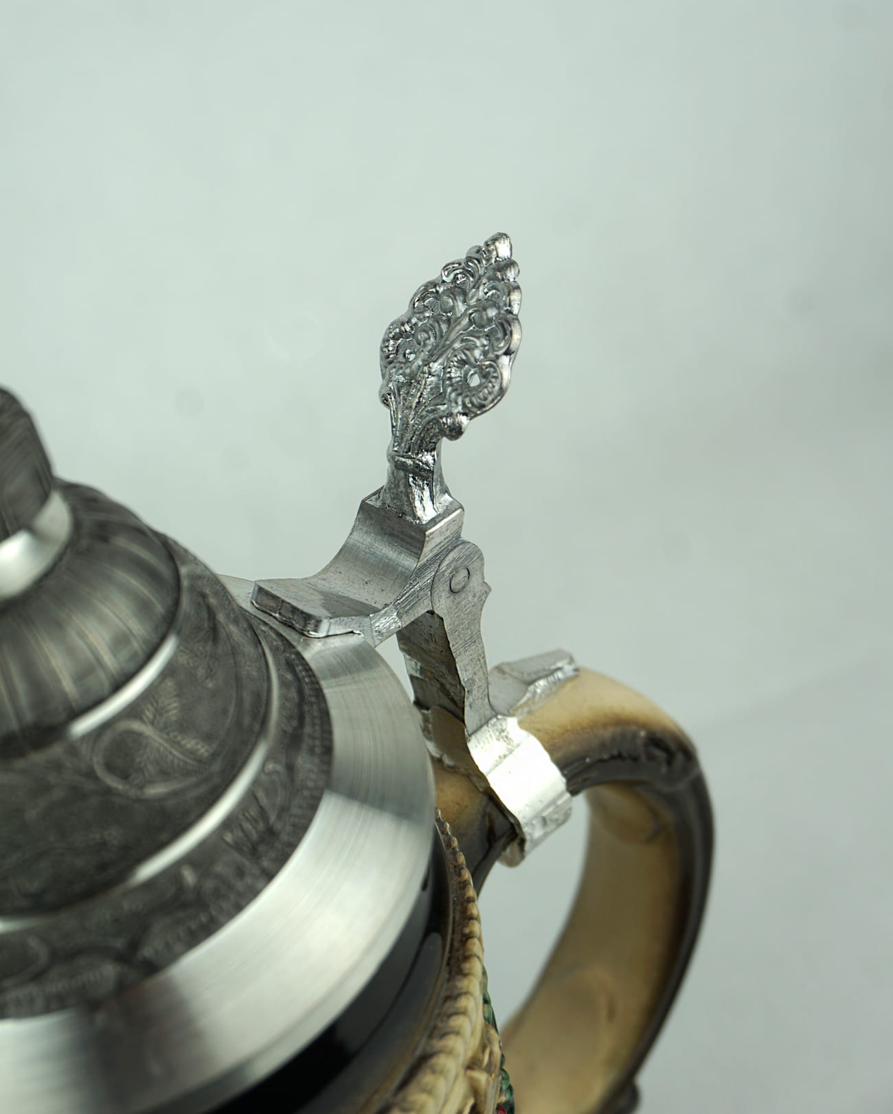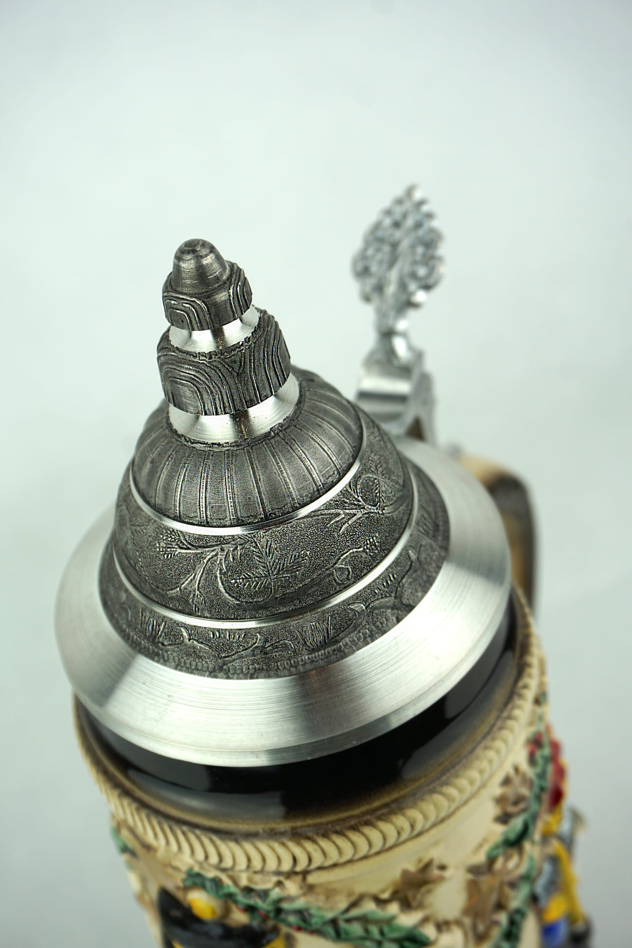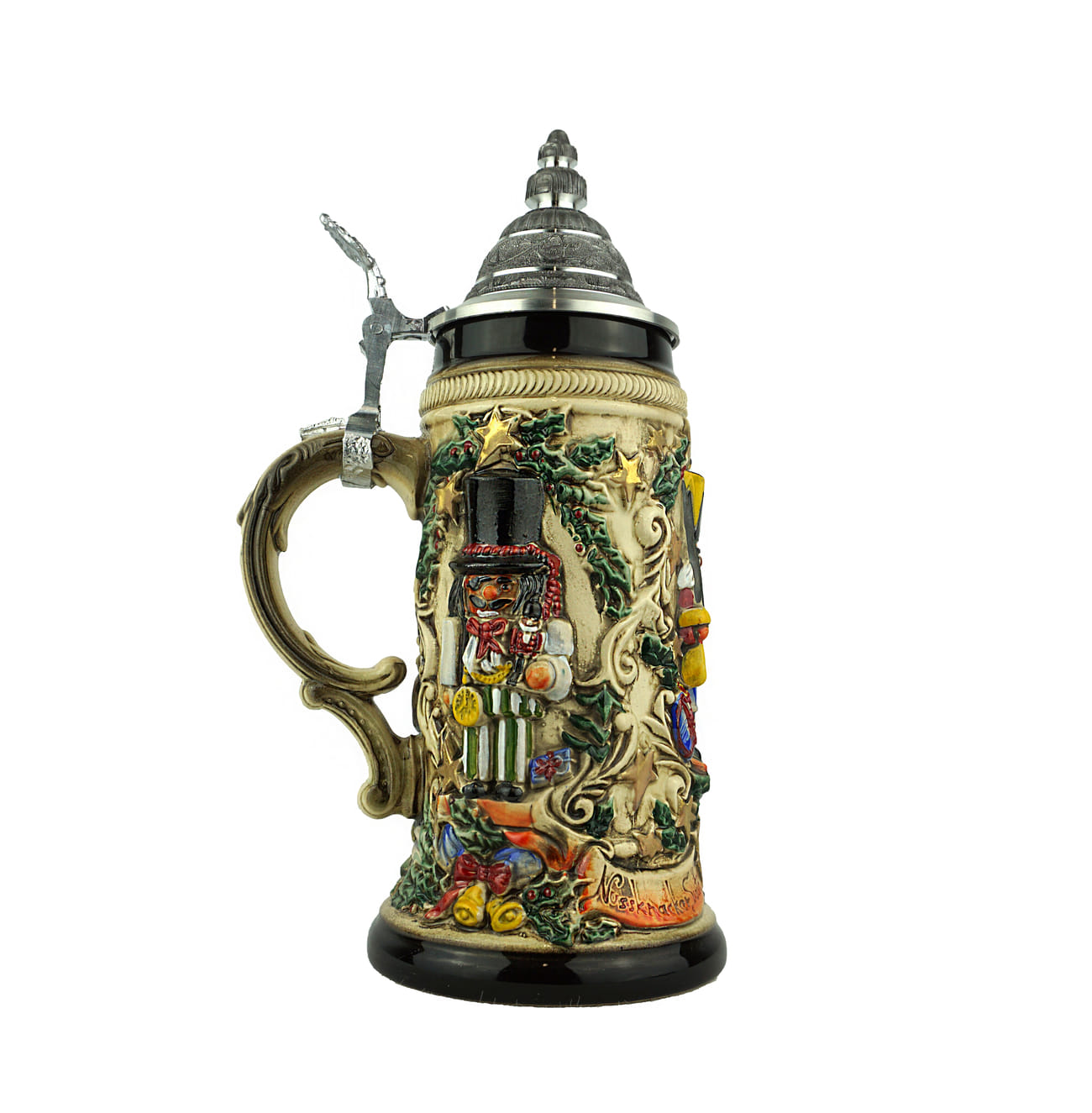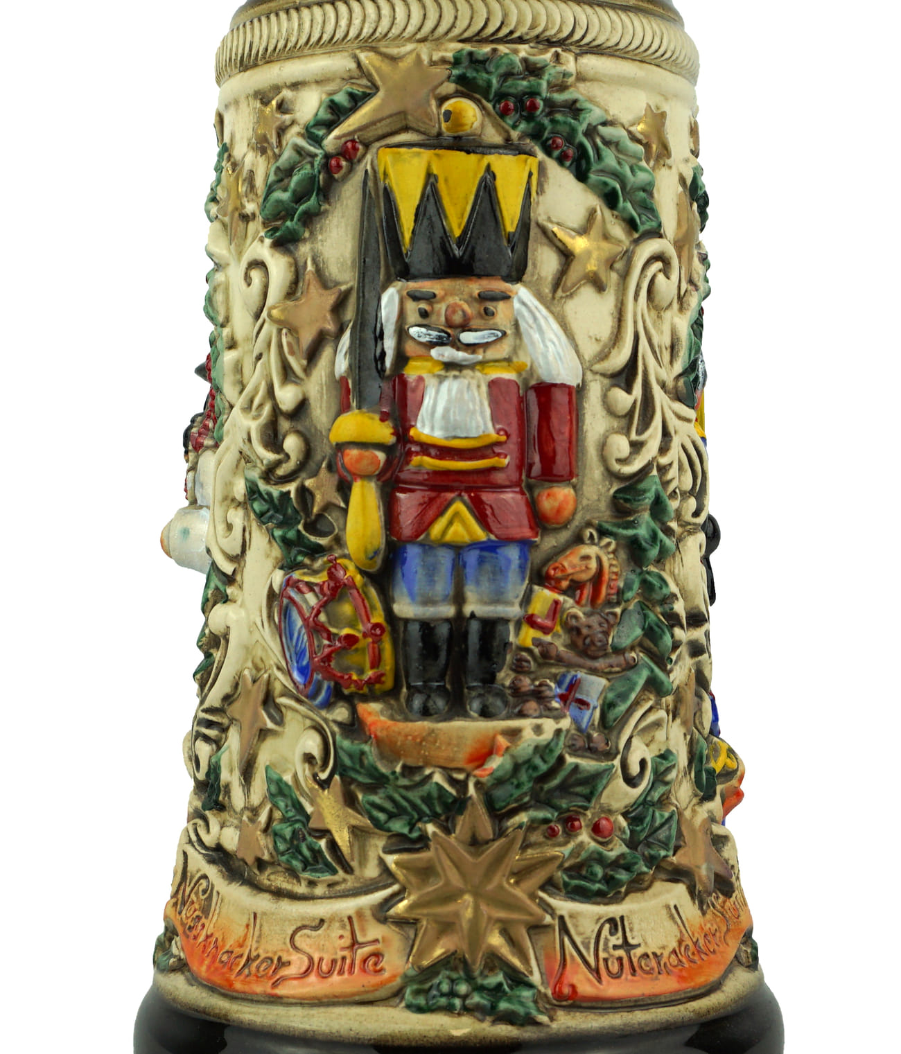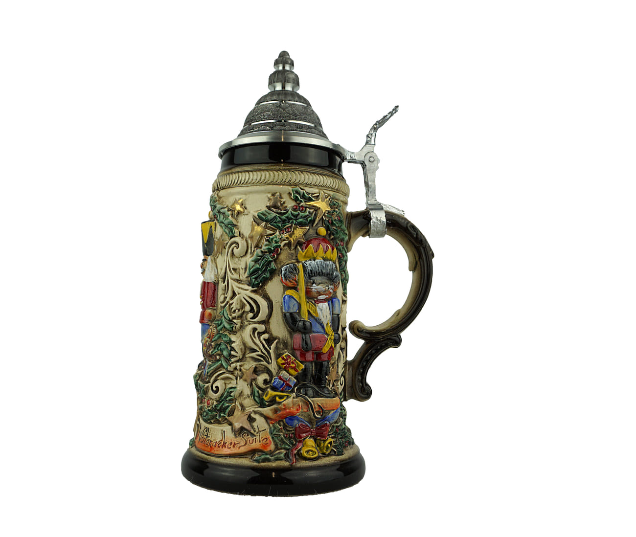 Christmas decoration beer mug, carefully-carved in clay with a 3D-effect, and with 3 nutcrackers. The nutcrackers are precisely-painted, which makes this beer mug one of our most popular Christmas gifts. This beer stein is a limited edition and is individually numbered by the painter (5,000 of them worldwide). Certificate of authenticity included.