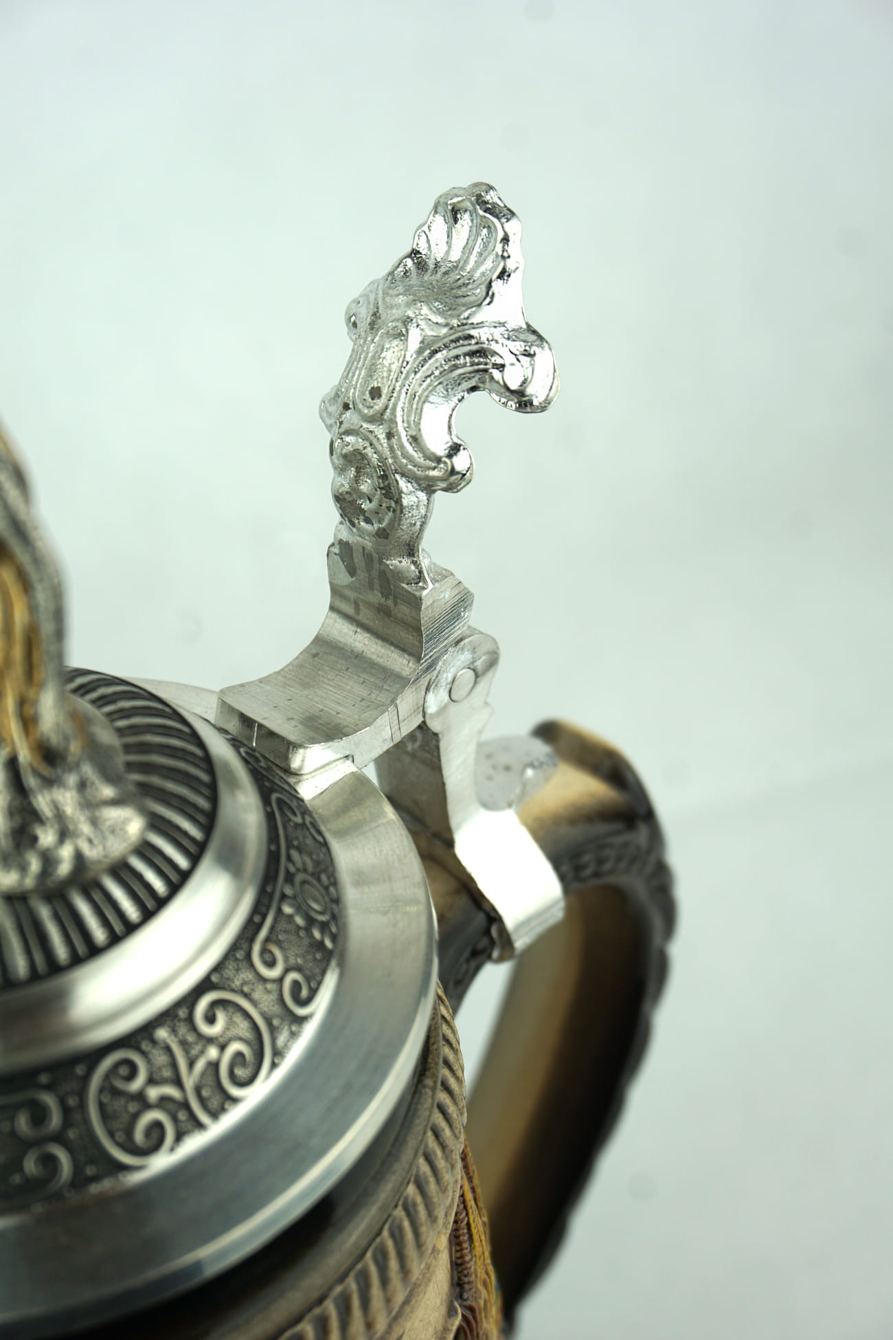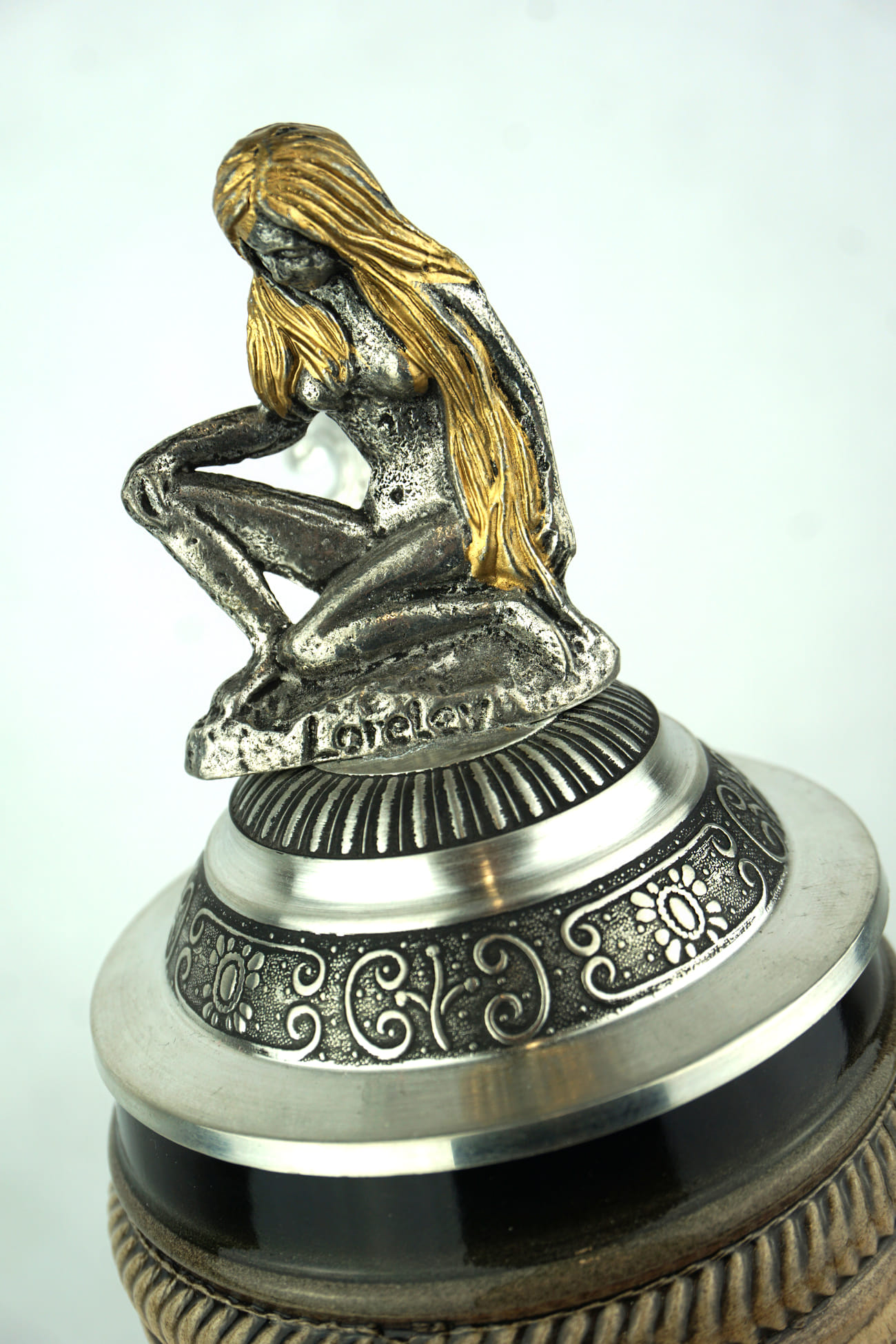 According to a German legend, a long-blond-haired girl called Loreley was sitting on the rock on the Rhine. combing her golden hair and singing a sweet melody. This appearance and the vocals were so enchanting that the sailors looked up to Loreley and drove into the dangerous reefs, rocks, and shoals of the river, many of them dying here. This beer stein is a limited edition and is individually numbered by the painter (5,000 of them worldwide). Certificate of authenticity included.