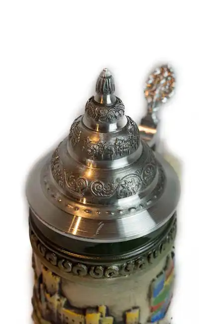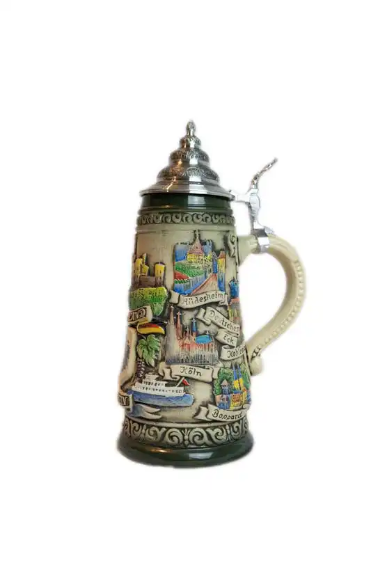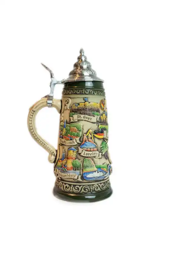 Large, decorated beer stein showing sights seen on a Rhine cruise. What makes this mug a neat souvenir is the hand-painted rustic style and the detailing all around. This beer stein is a limited edition and is individually numbered by the painter (10,000 of them available worldwide).