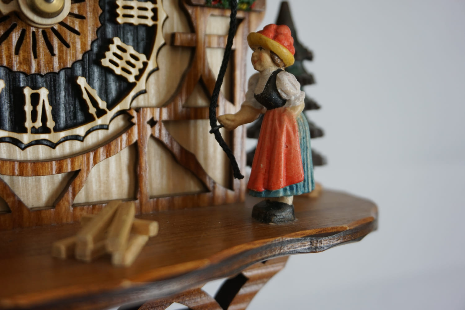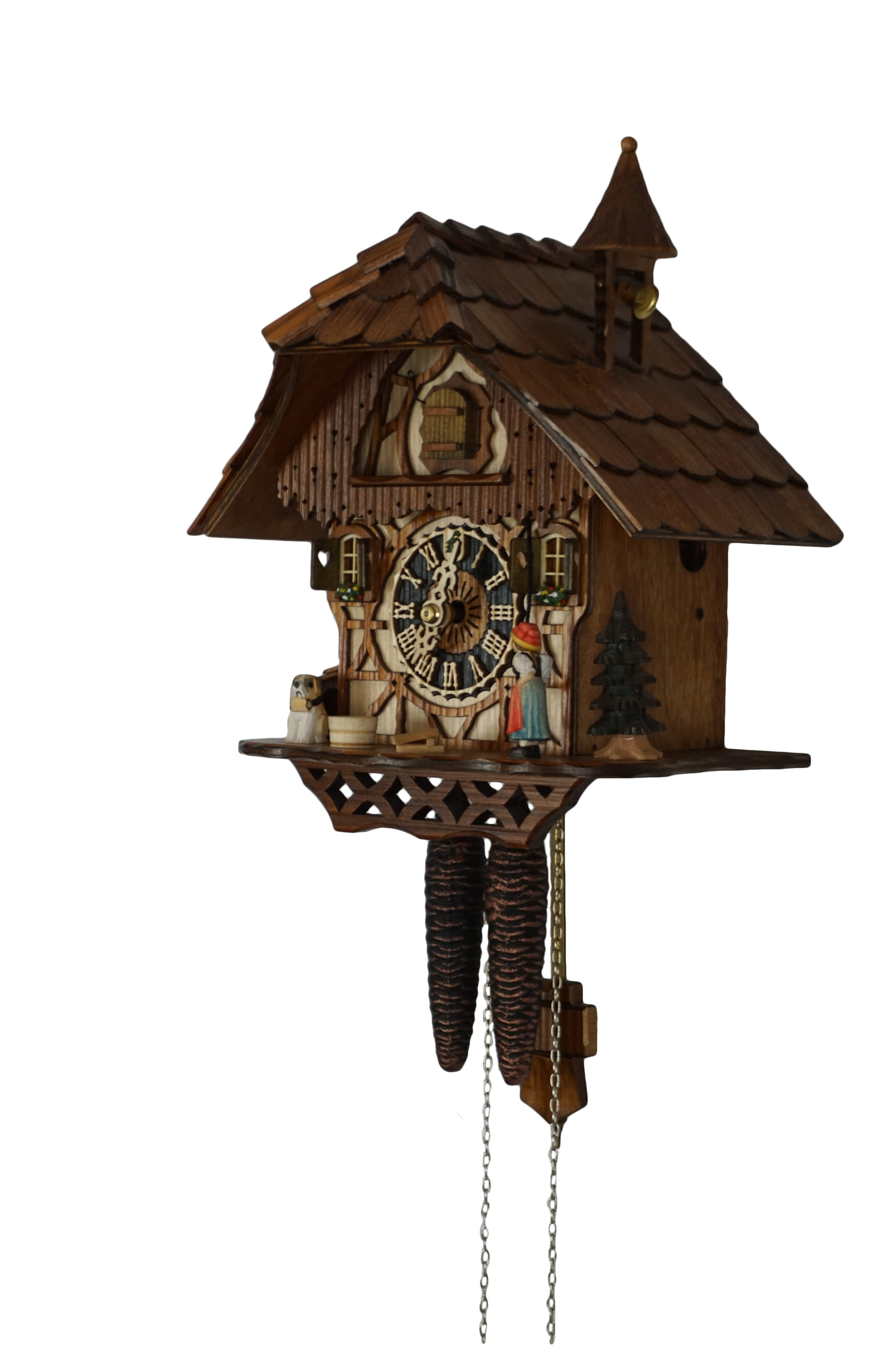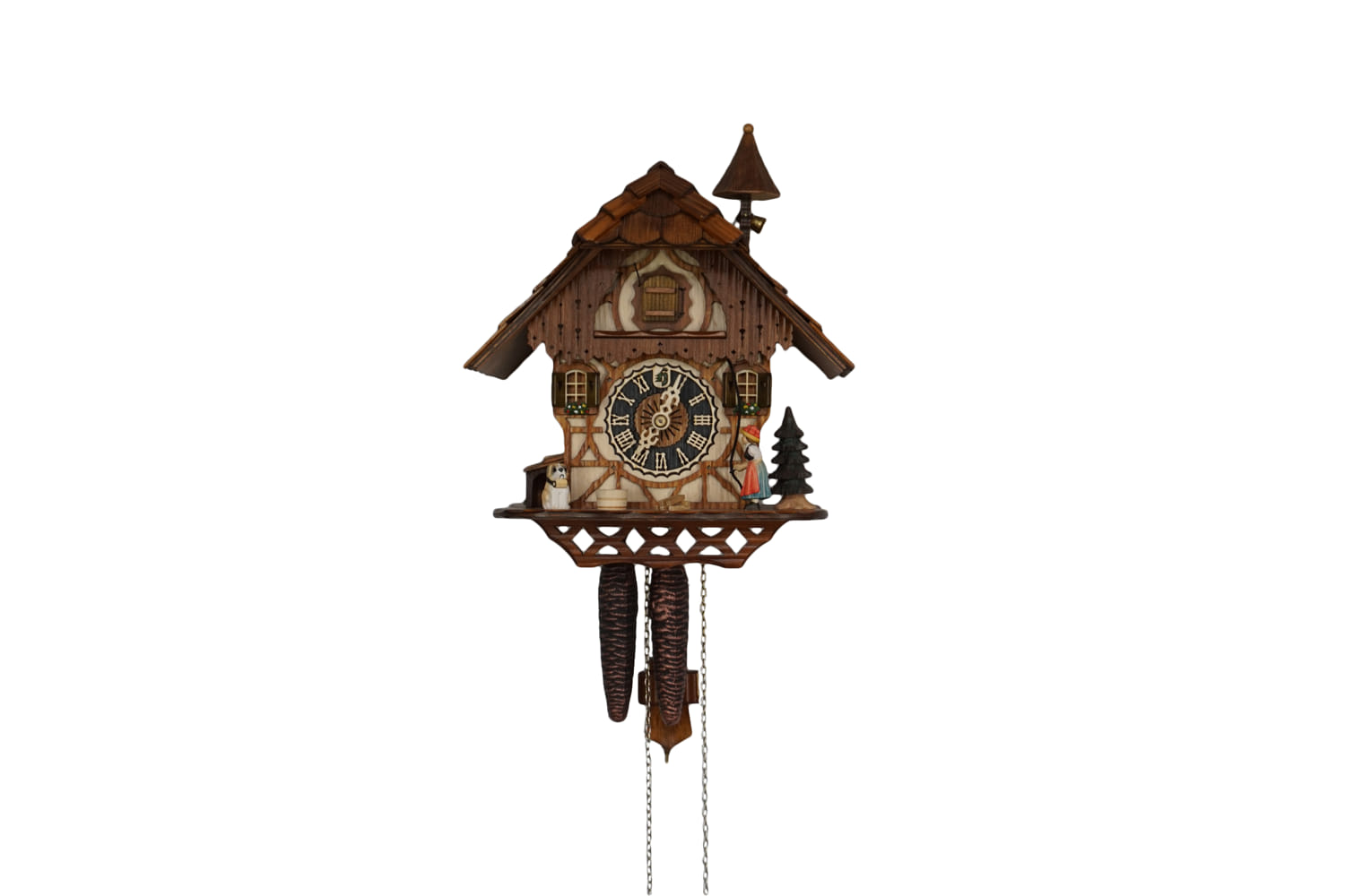 Features: High-pitched cuckoo sound, chimes once on the half an hour and varyingly on the full hour, depending on the hour (i.e. 7 o´clock – 7 times). Black Forest lady pulls the bell as many times as cuckoo calls.