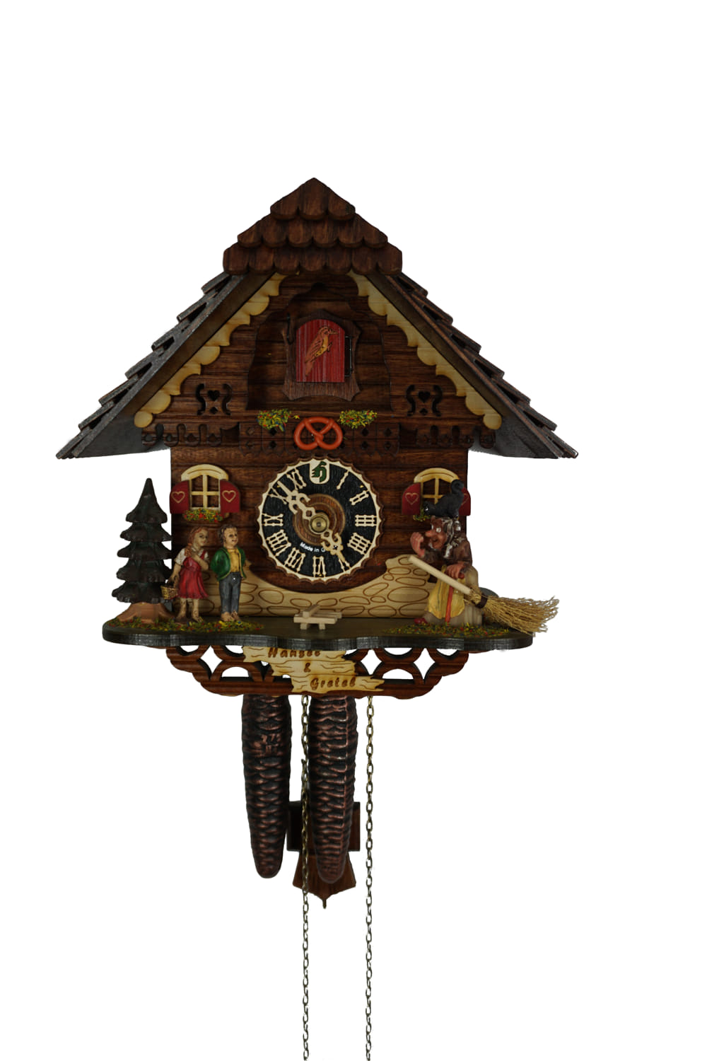 This colorful clock design is based on the well-known “Hansel & Gretel” story line. Figurines of Hansel, Gretel, and the Witch with a cat on her shoulder are standing in front of the “house made of sweets.” Features: High-pitched cuckoo sound, chimes once on the half an hour and varyingly on the full hour, depending on the hour (ex. 7 o´clock - 7 times).