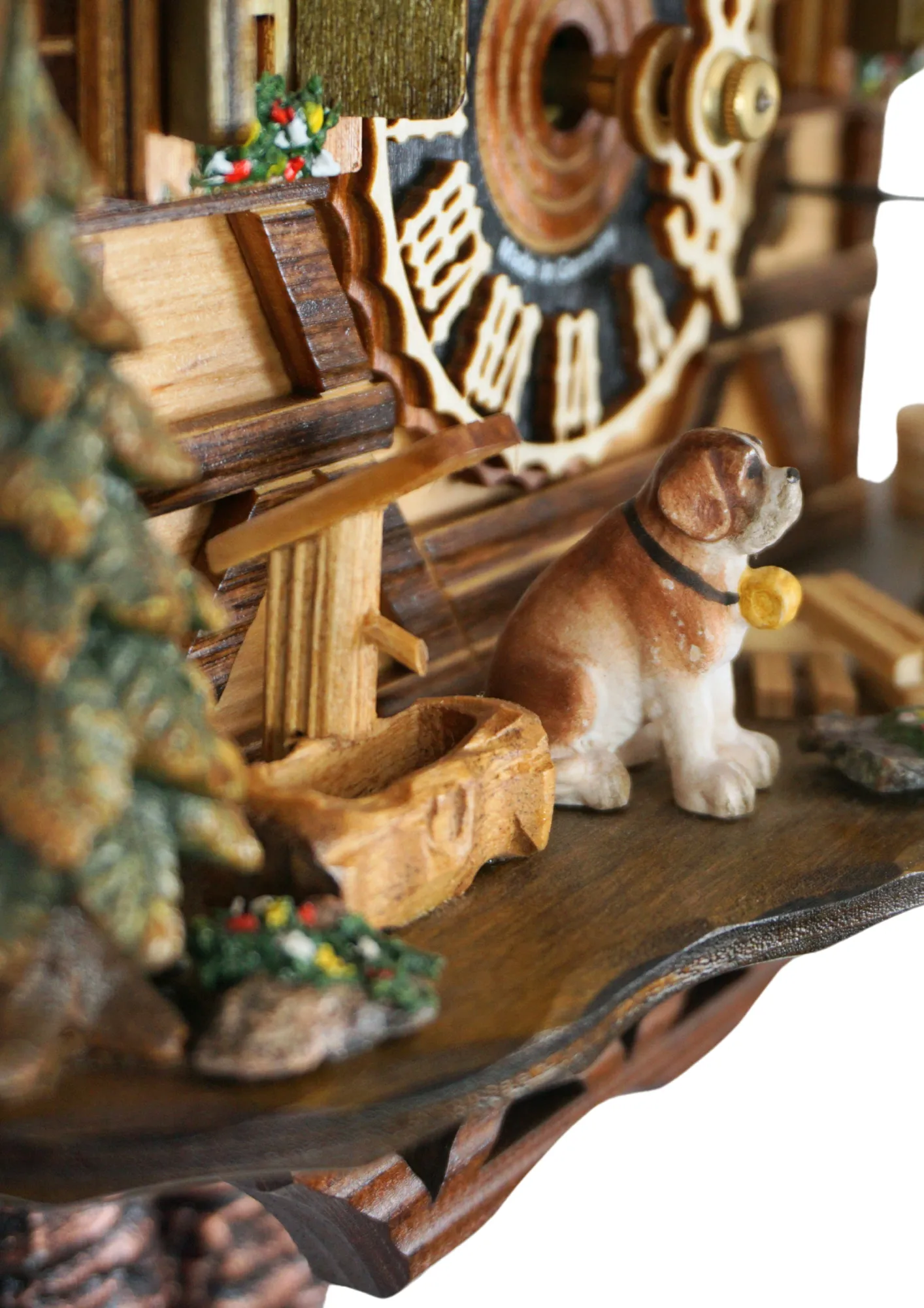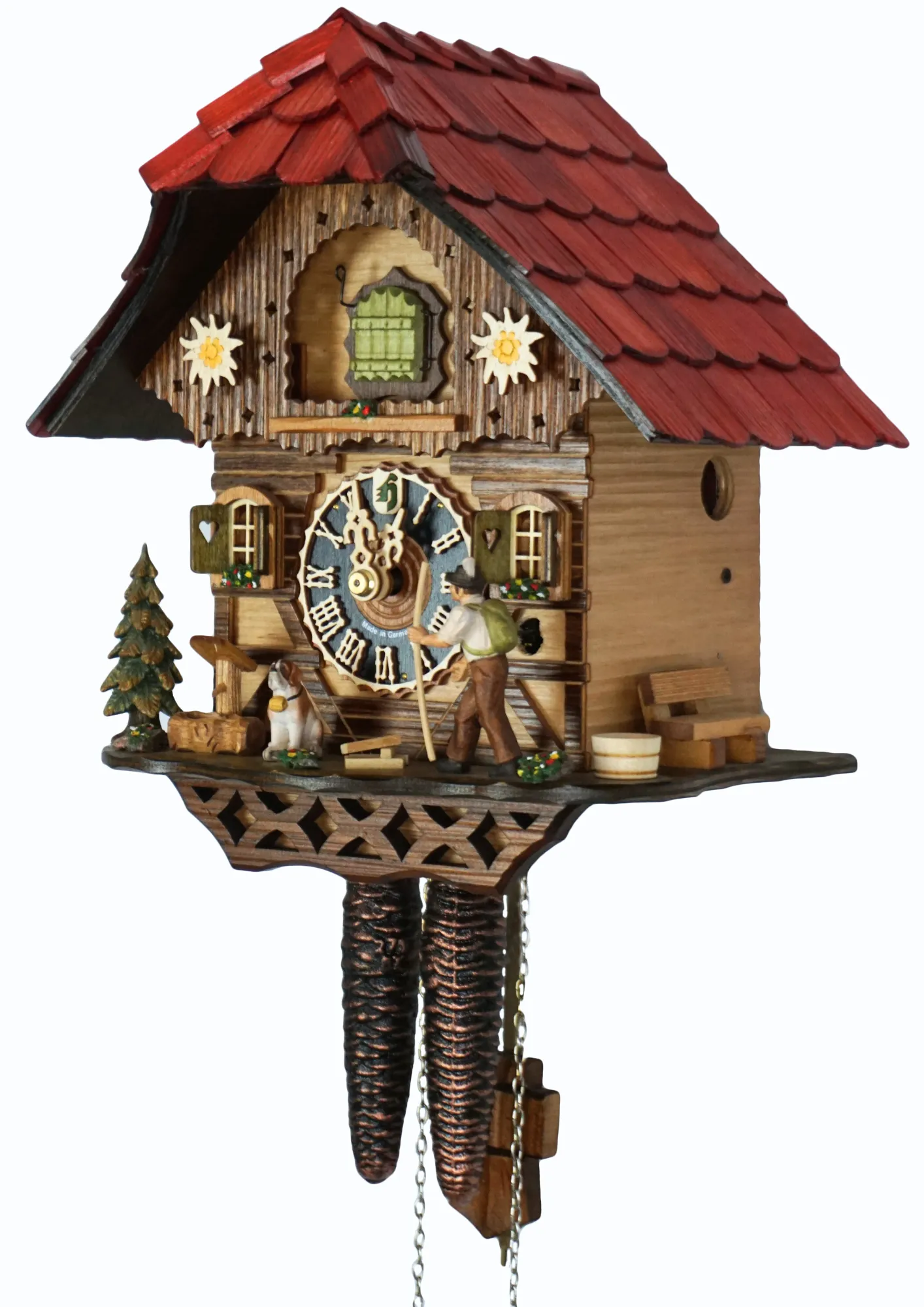 Classic traditional Black Forest house known as “Hüsli” with unusual red roof and delicately-made edelweiss flowers on each side. Clock shows a hiker and his dog enjoying the landscape of the Black Forest.