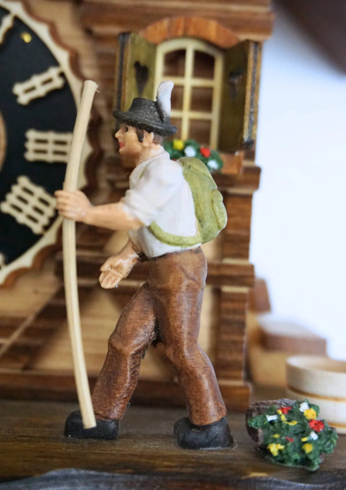 Features: High-pitched cuckoo sound, chimes once on the half an hour and varyingly on the full hour, depending on the hour (ex. 7 o´clock - 7 times). Hiker moves his stick and right hand every time the cuckoo comes out.