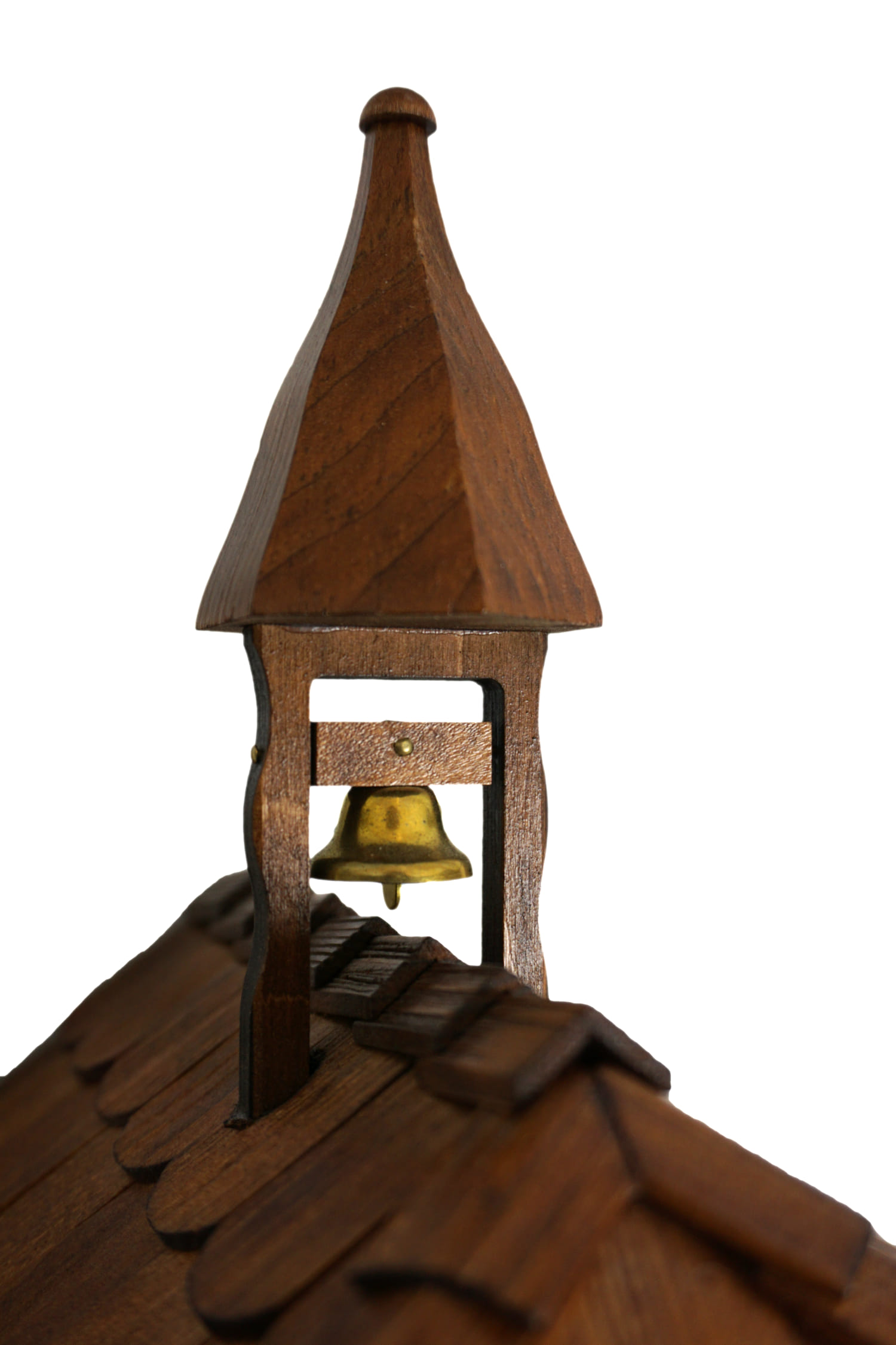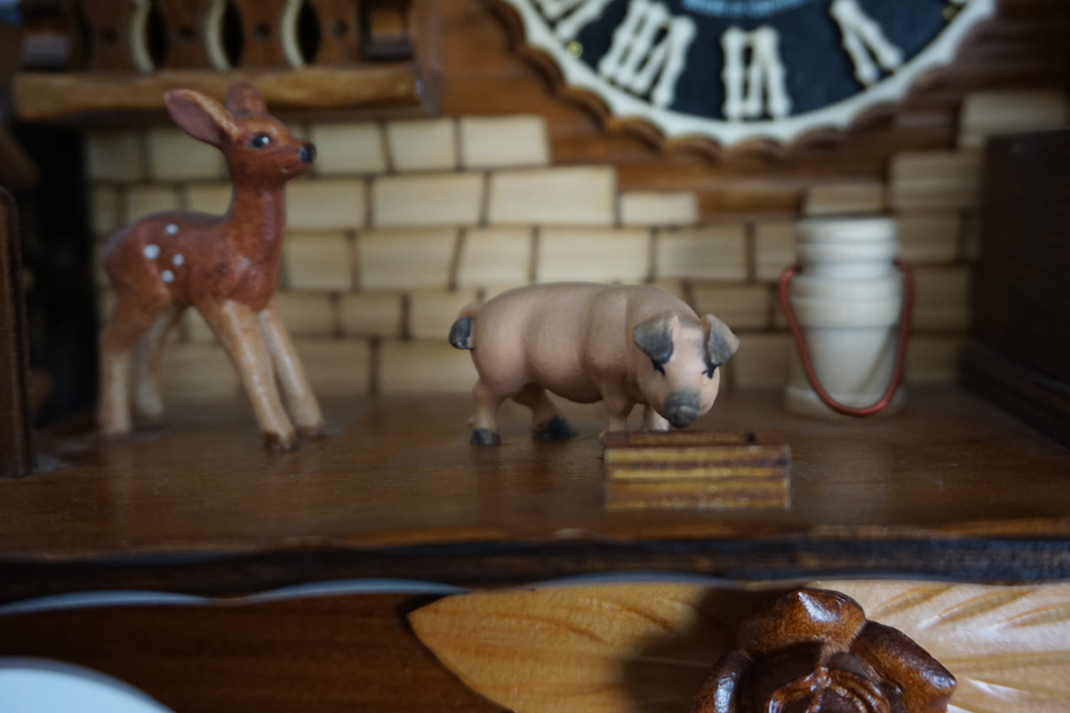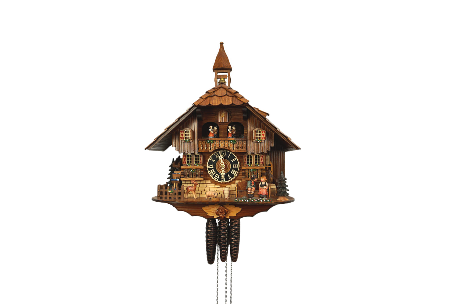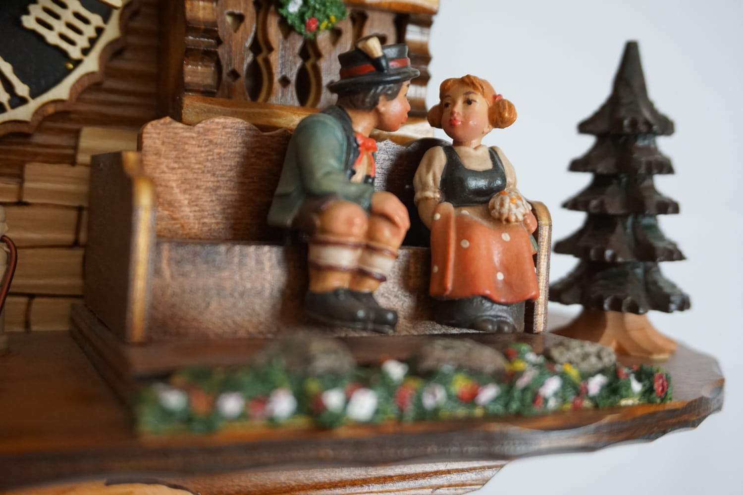 Features: Medium-pitched cuckoo sound, chimes once on the half an hour and varyingly on the full hour, depending on the hour (i.e. 7 o´clock – 7 times). The couple is kissing, water wheel turns and the figures dance while music is playing.