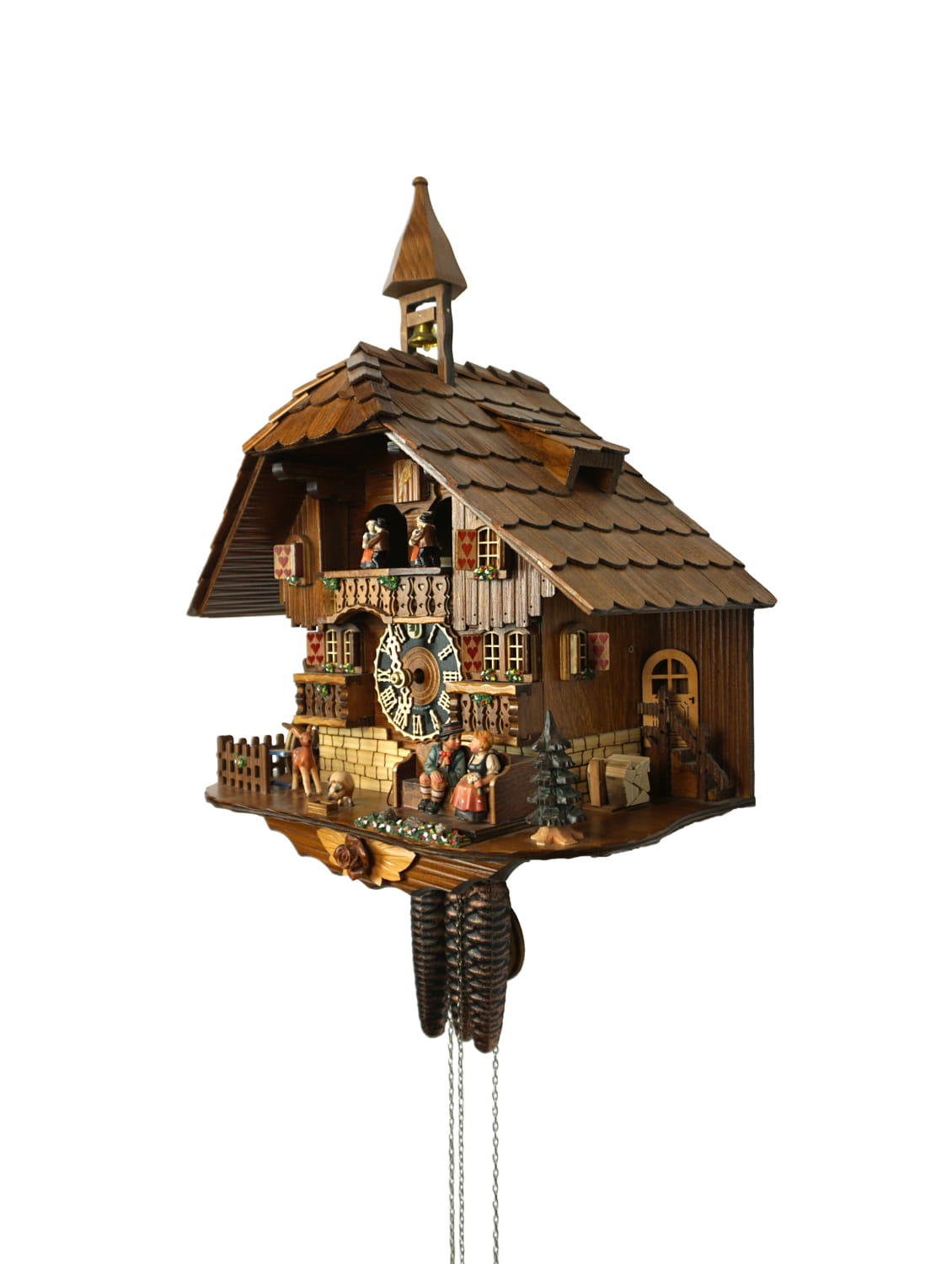 This clock shows a romantic Black Forest scene with a couple kissing on the bench. Very detailed, with decorative hearts on the window shutters, and animals under the clock's face, this clock represents a honeymoon and would make a perfect wedding gift.