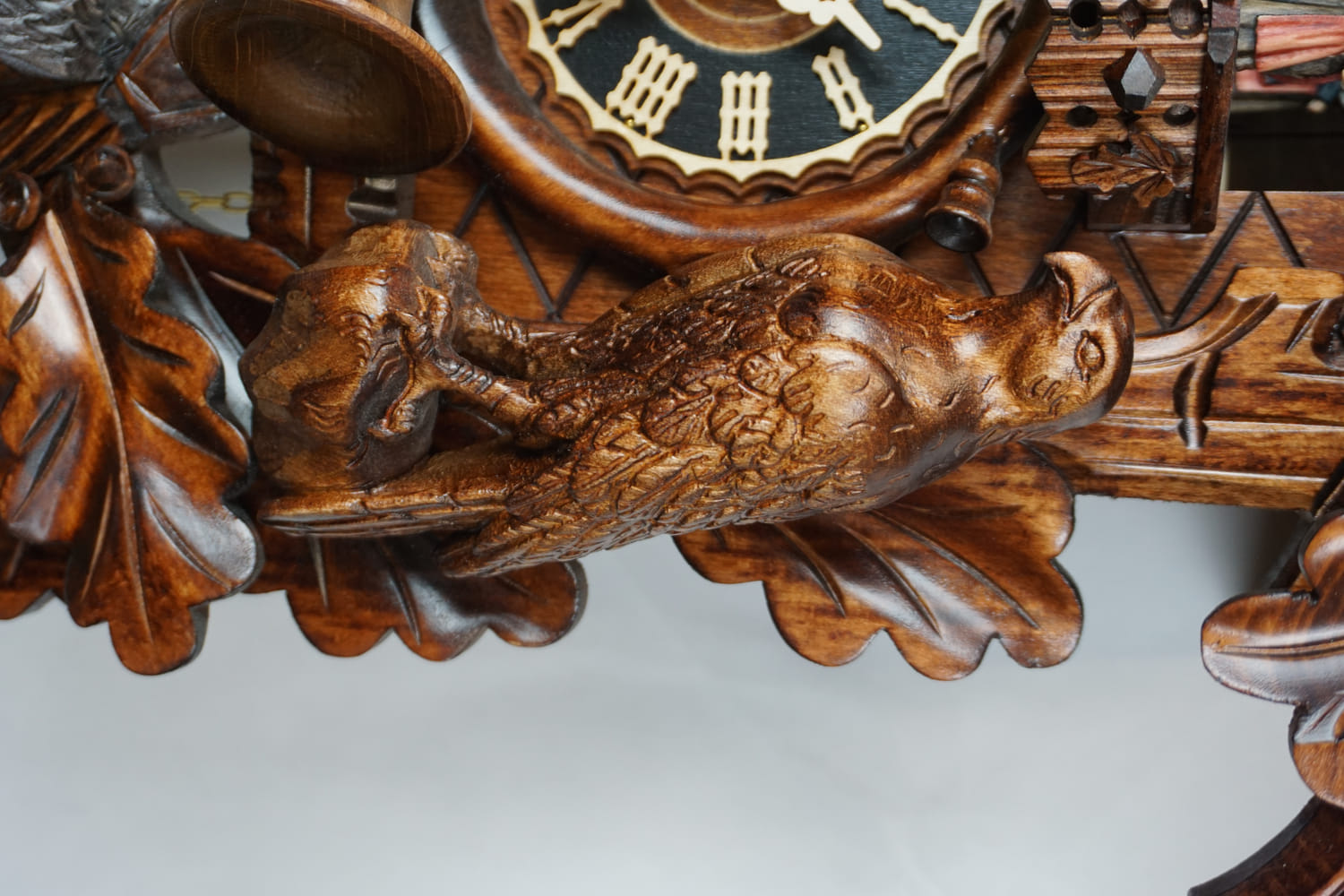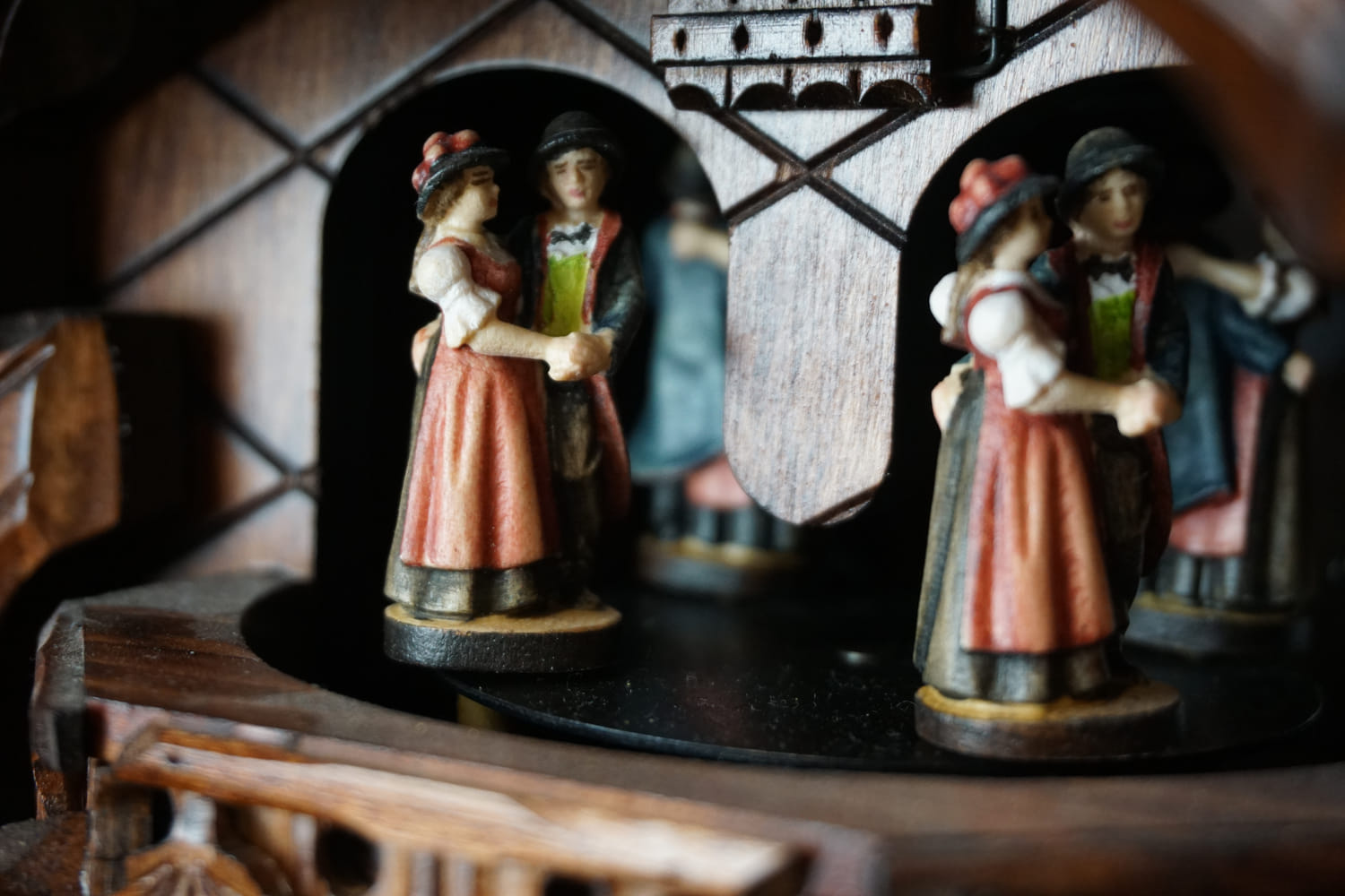 Features: Low-pitched cuckoo sound, chimes once on the half an hour and varyingly on the full hour, depending on the hour (i.e. 7 o´clock – 7 times). Figures dance while music is playing.