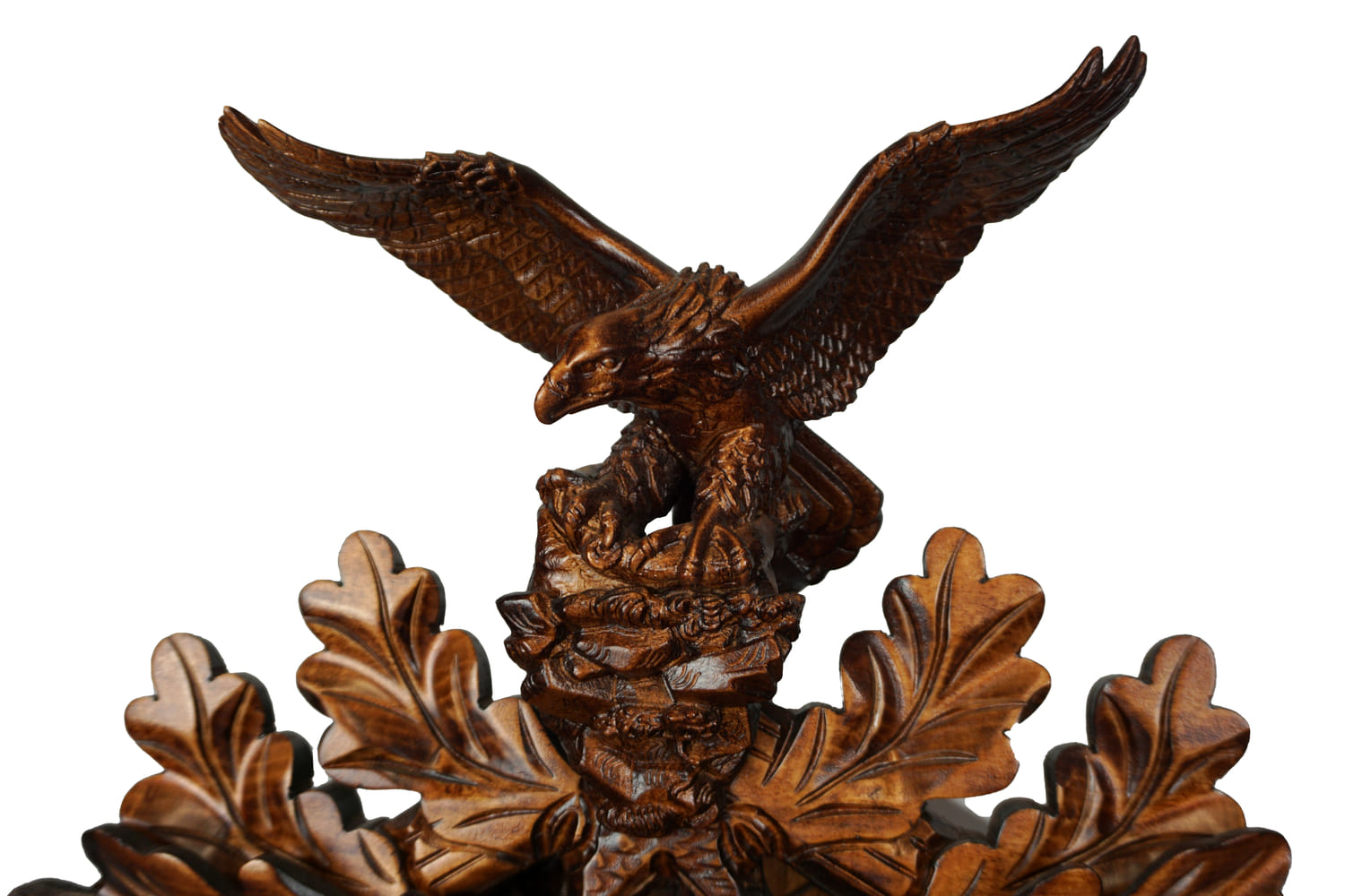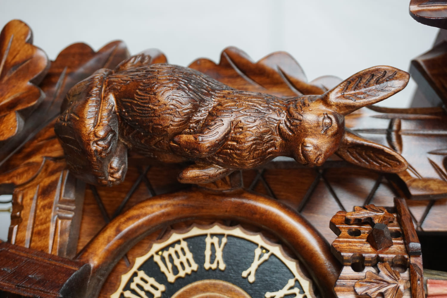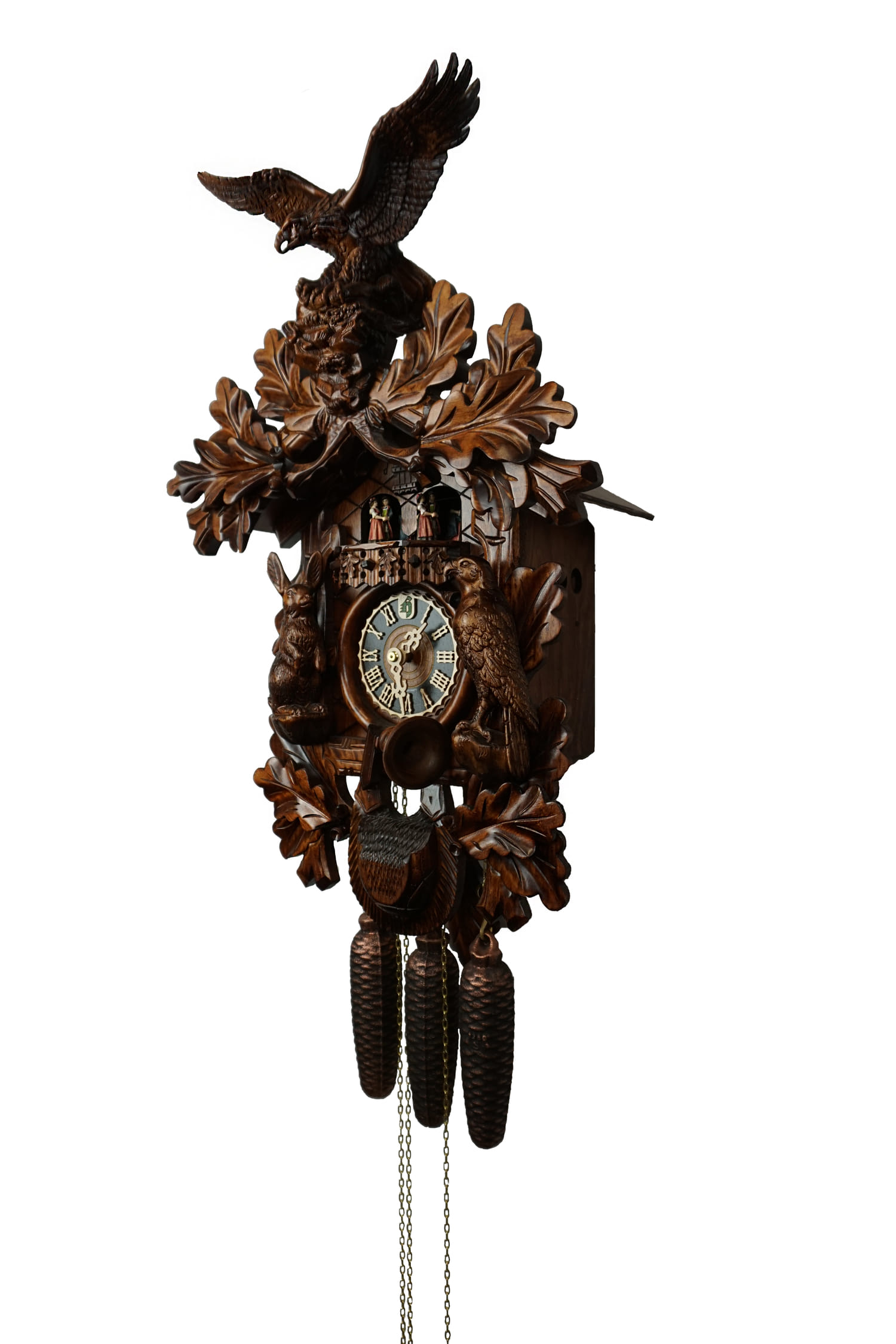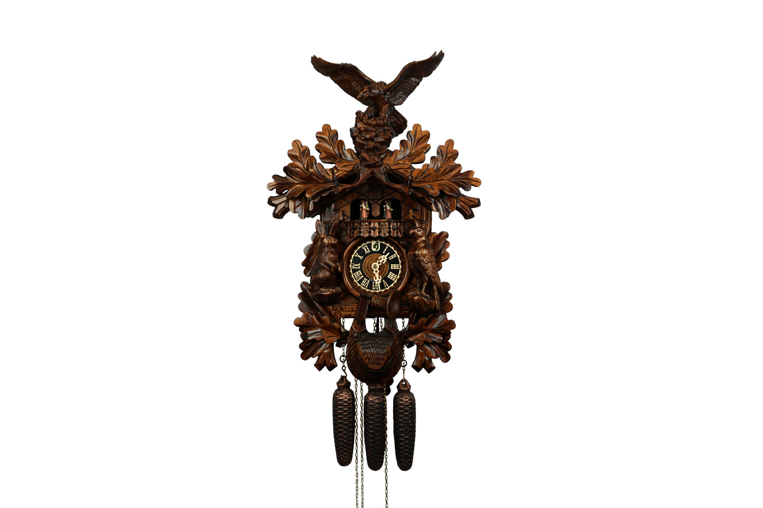 This clock shows wildlife in an oak forest. The entire frame is decorated with oak leaves, with an eagle in landing motion on the top, and a rabbit and falcon on the sides. A hunting horn can be found around clock's dial and a hunting pouch is located in the lower section.