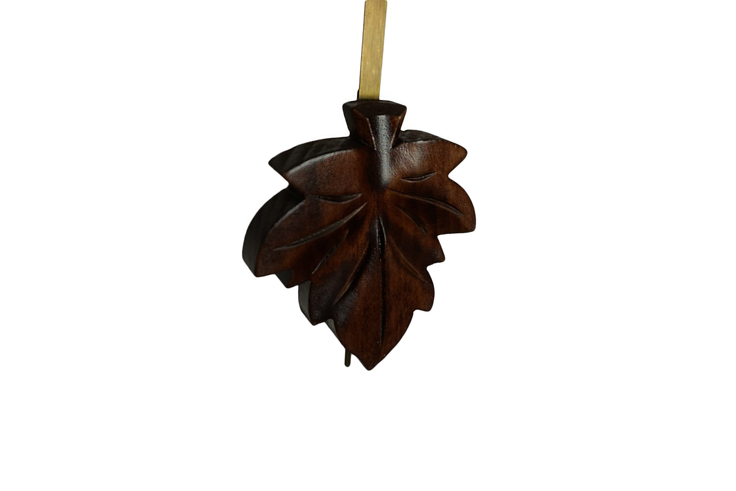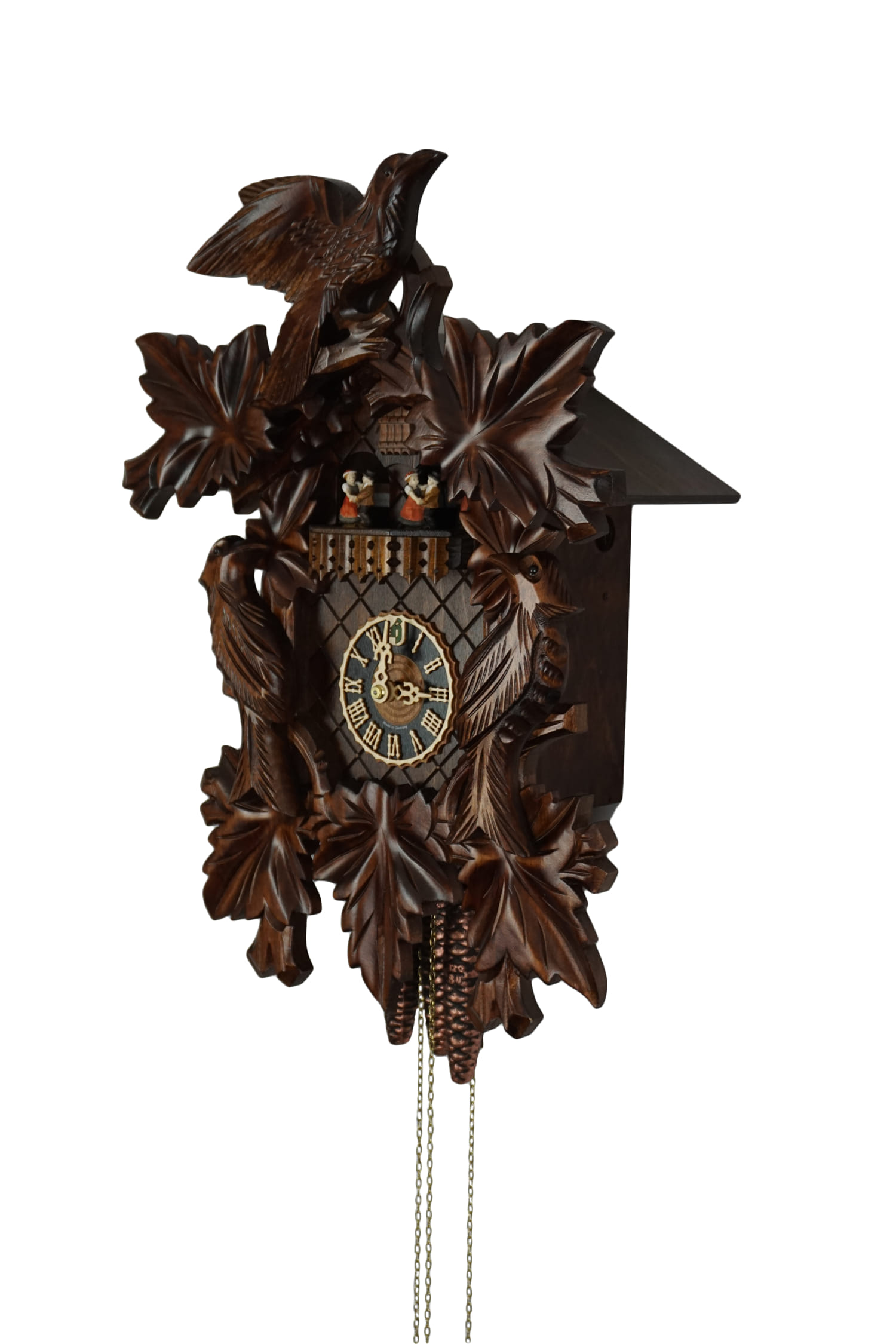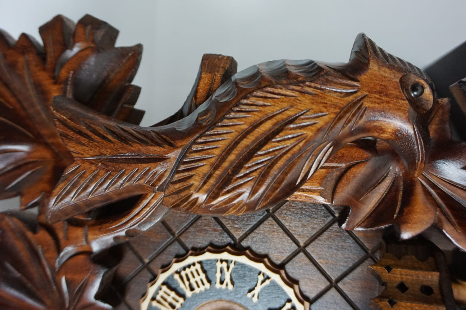 Traditional monocolor cuckoo clock with frame made with vine leaf carvings, a cuckoo bird on top, and woodpeckers on the sides.