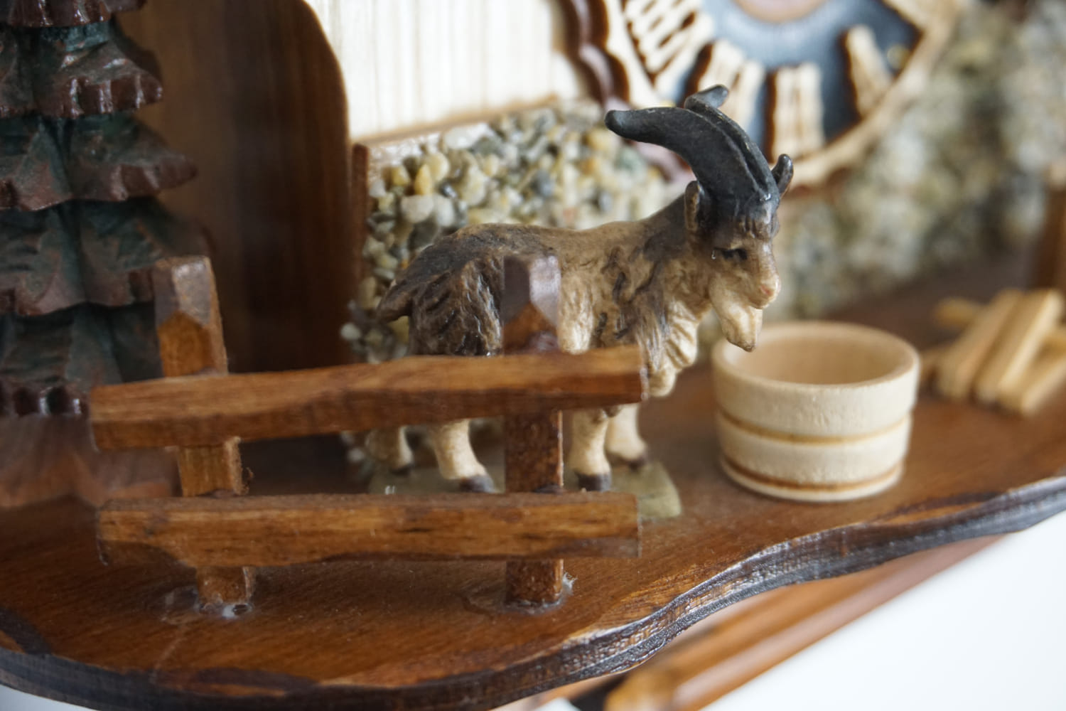 Features: High-pitched cuckoo sound, chimes once on the half an hour and varyingly on the full hour, depending on the hour (i.e. 7 o´clock – 7 times). Worker chops wood as many times as cuckoo calls.
