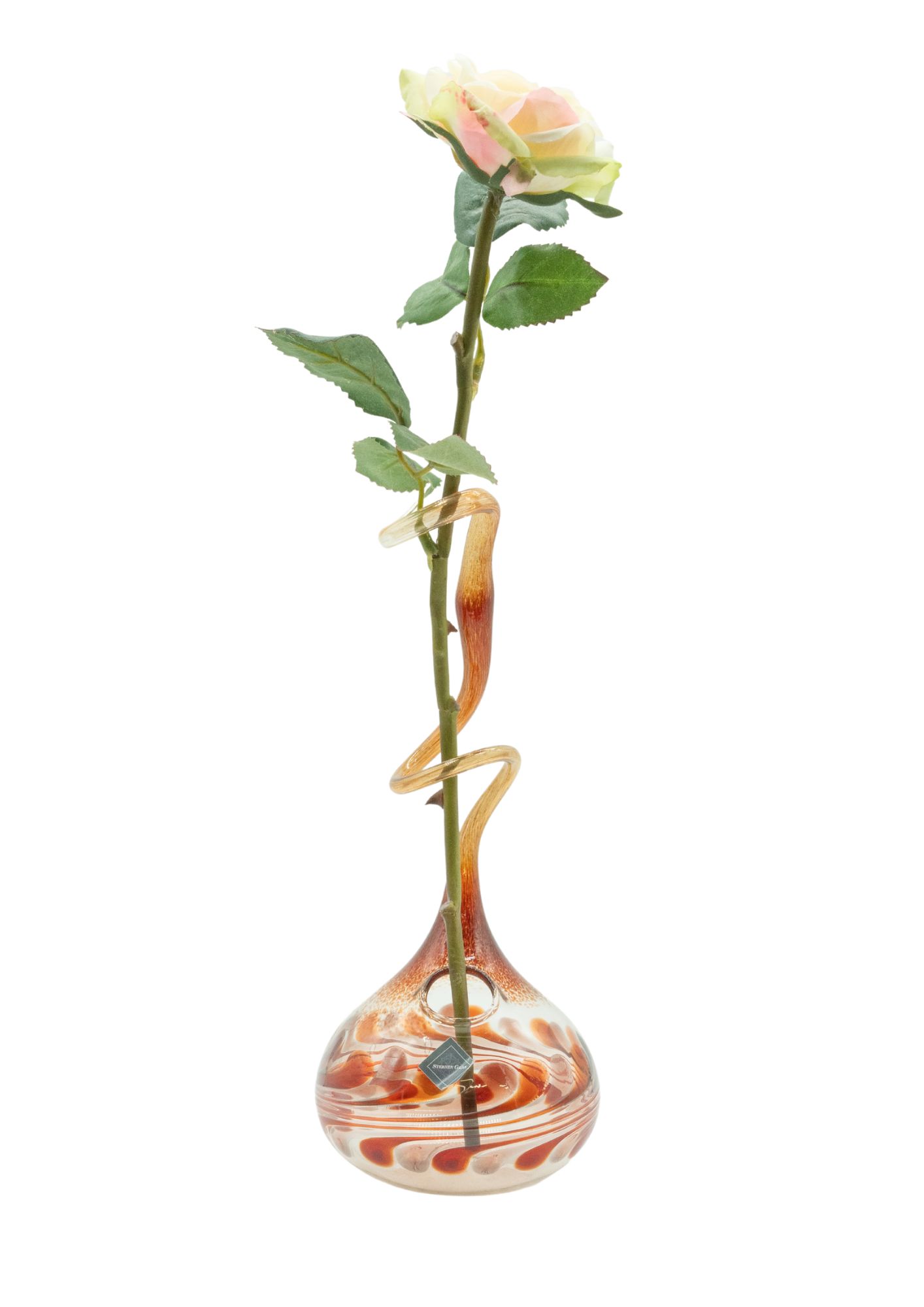 Gift yourself or a loved one this glassblower's creation—a work of art that not only holds a delicate bloom but elevates it to a realm of unparalleled artistry. Let the singular beauty of a lone rose find its perfect complement in this hand-crafted masterpiece, where the union of nature and craftsmanship unfolds in a harmonious ballet of elegance and grace.