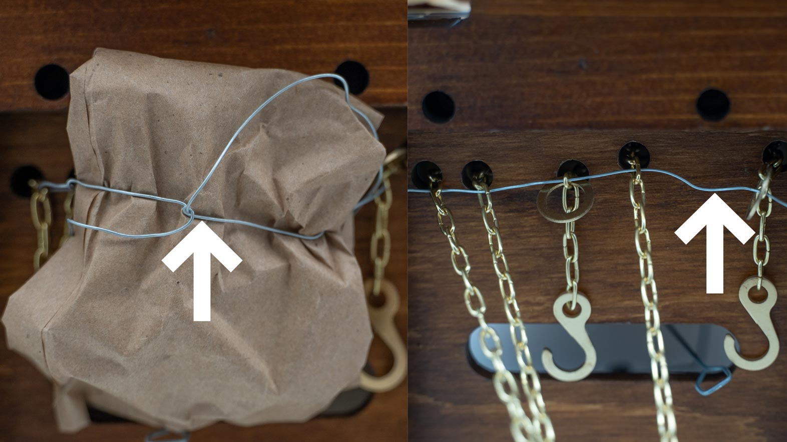 Pull the chains up so that the hooks are under the case cuckoo clock. Insert a piece of string, wire or a twist wrap through all the chains as close as possible to the bottom of the case. Bundle up the chains in a piece of aluminum foil and tie up tightly with a rubber band, tape or string. This prevents the chains from coming off the wheels, and creating a snarled mess of chains inside the clock.
